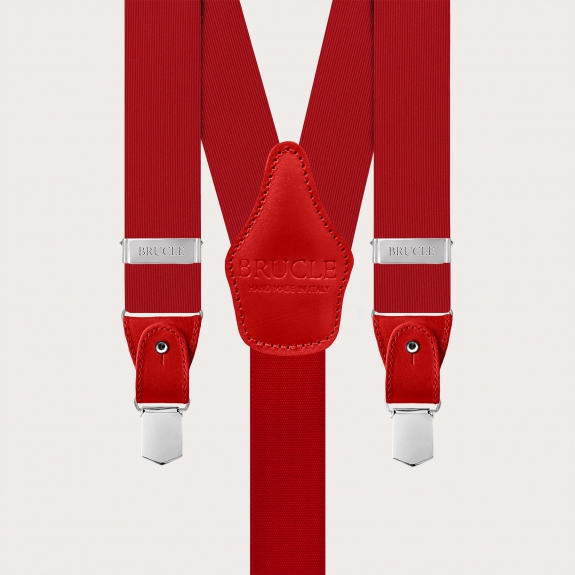 A formal 2in1 Brucle red suspender fitted with full-grain leather paddles and shining nickel hardware.