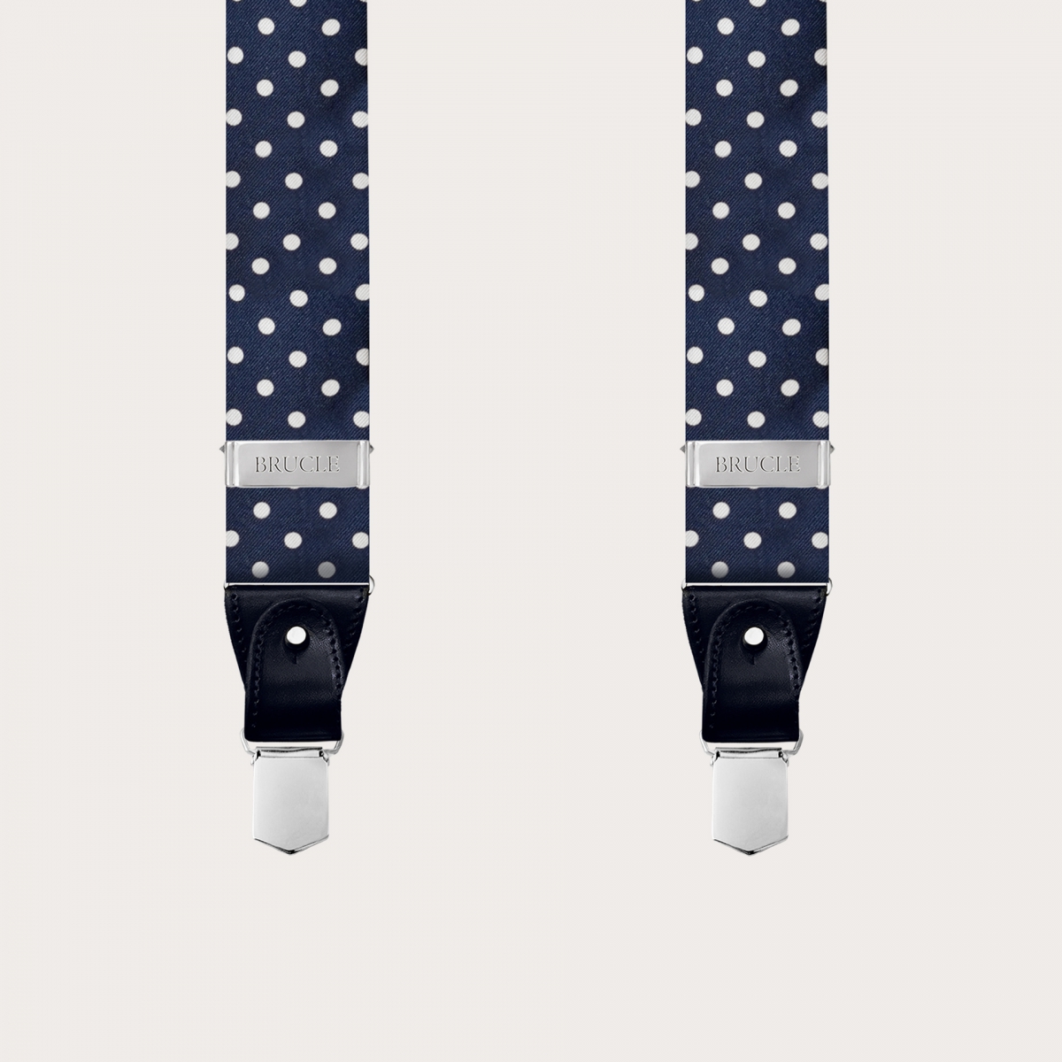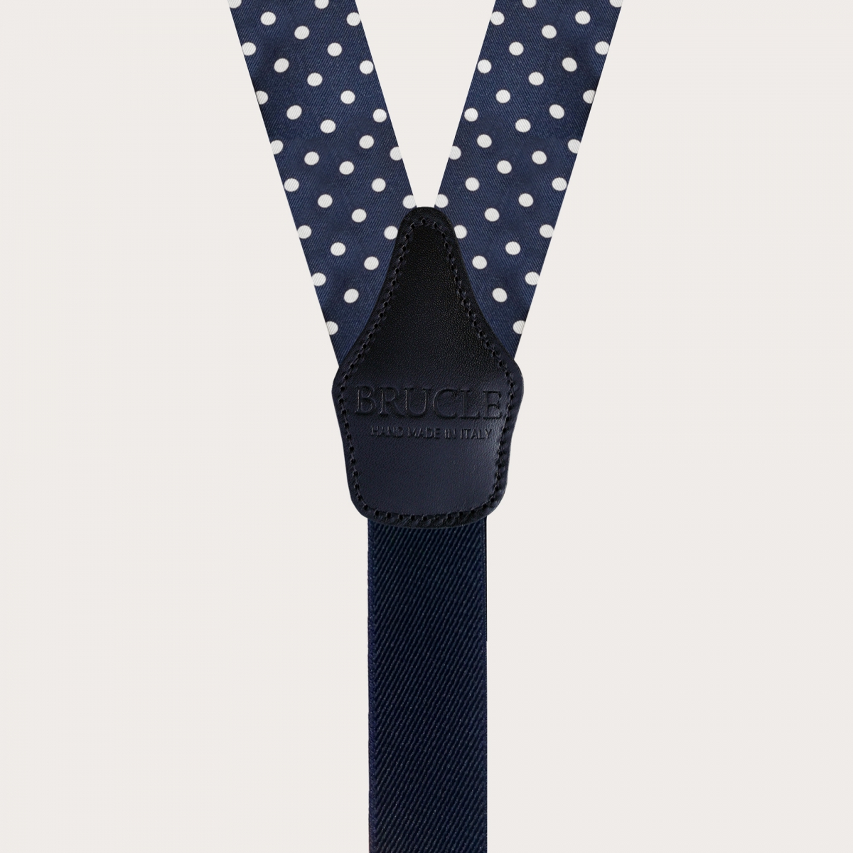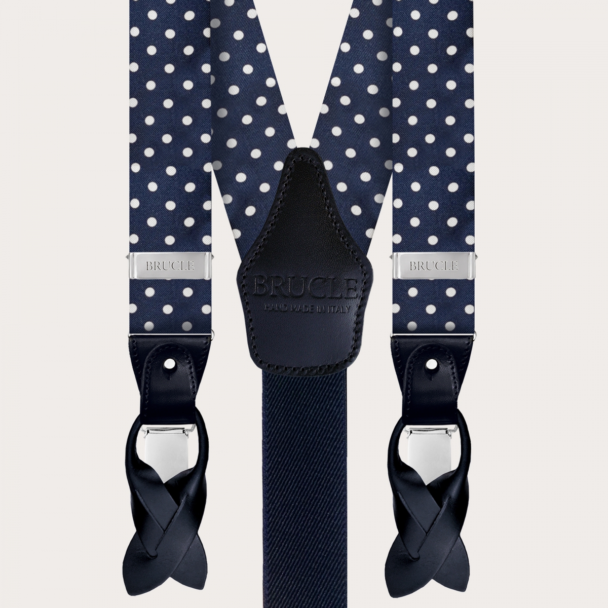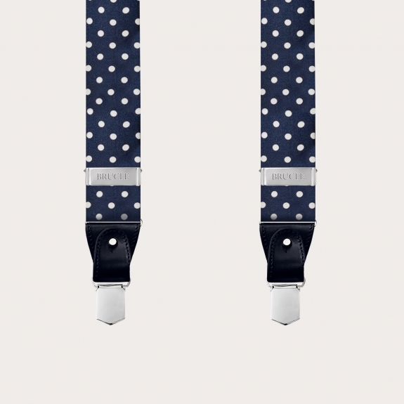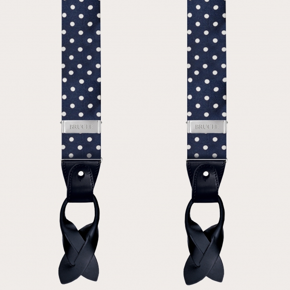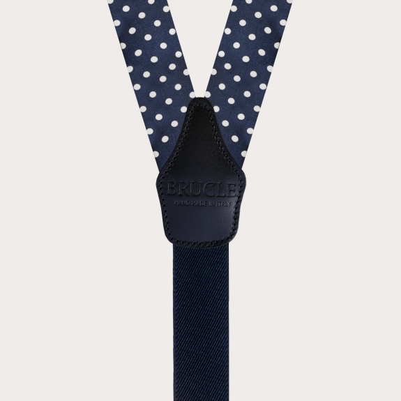Discover the elegant men's suspenders by Brucle in diamond jacquard silk with a blue pin dot design, a masterpiece of craftsmanship that truly embodies the Made in Italy essence.