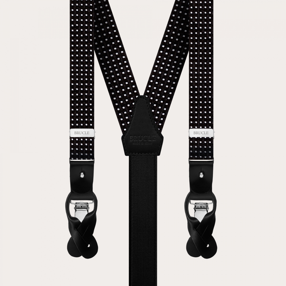 Formal 2in1 black skinny suspenders with dotted black pattern in silk from the new BRUCLE collection, fitted with full-grain leather paddles and shining nickel hardware.