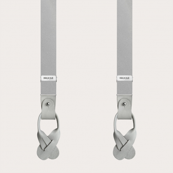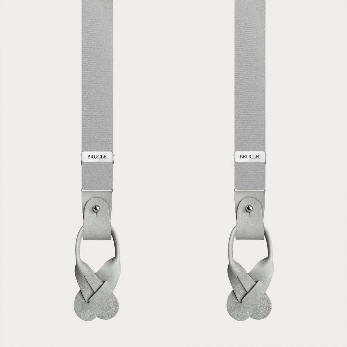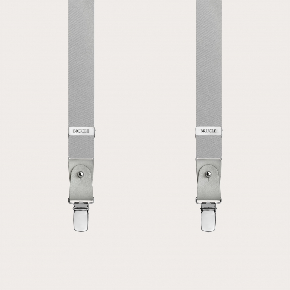 Grey slim suspenders in silk satin, available with buttons or clips, and matching leather parts. The grey silk men's suspenders are perfect for formal occasions and weddings. The front straps are adjustable, while the back strap is elastic to ensure a perfect fit. 100% Made in Italy. Customizable with engravings on leather parts and clips. Discover matching accessories such as ties, bow ties, and pocket squares.