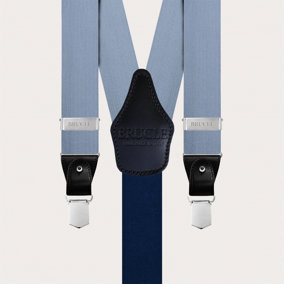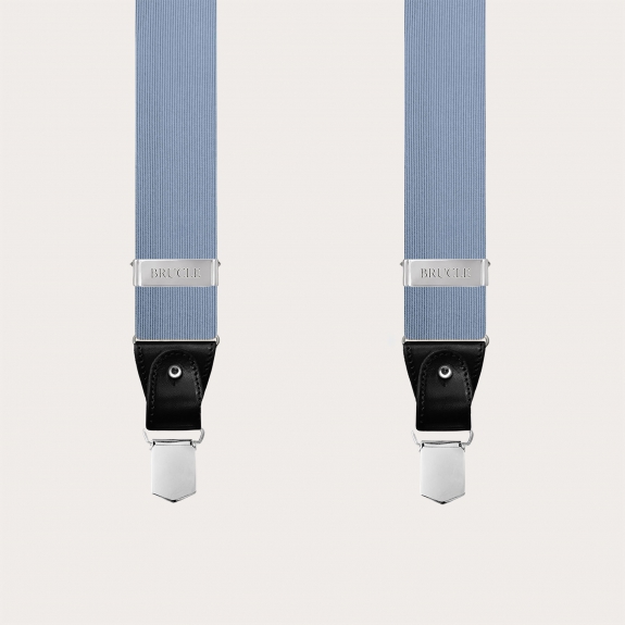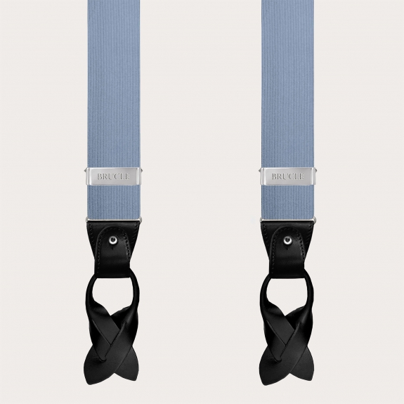 Refined light blue silk suspenders; the soft and luminous fabric is perfect for enhancing ceremonial outfits, especially in shades of blue.
