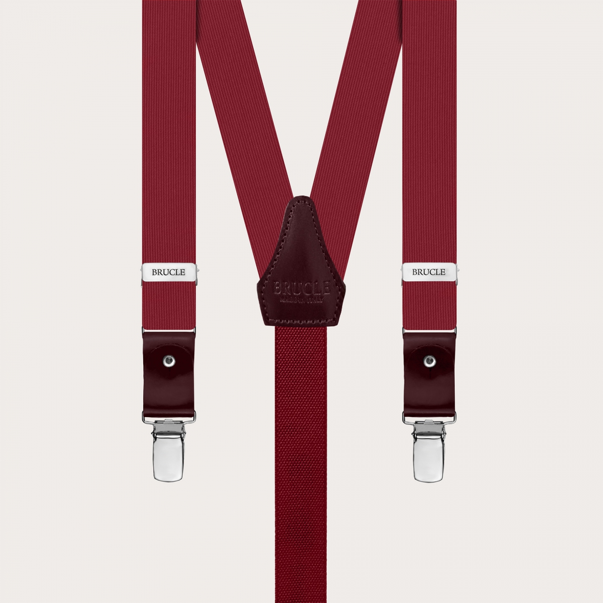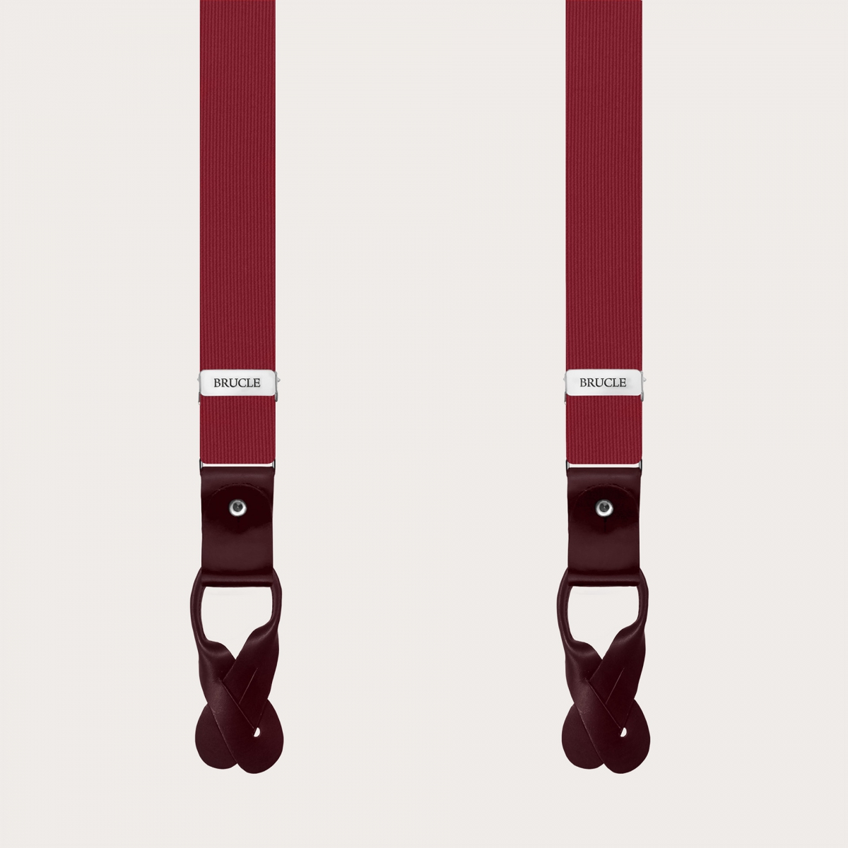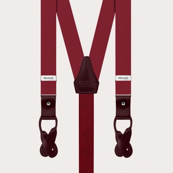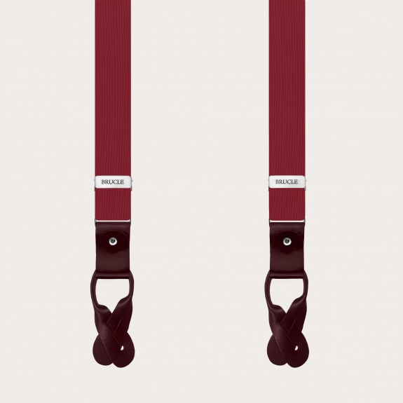 Elegant men's burgundy suspenders made of soft jacquard silk and completed with genuine bovine leather parts and high-quality metal fittings.