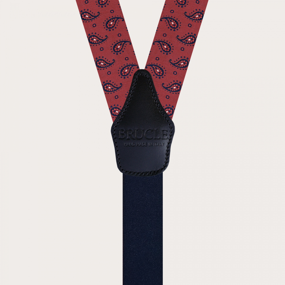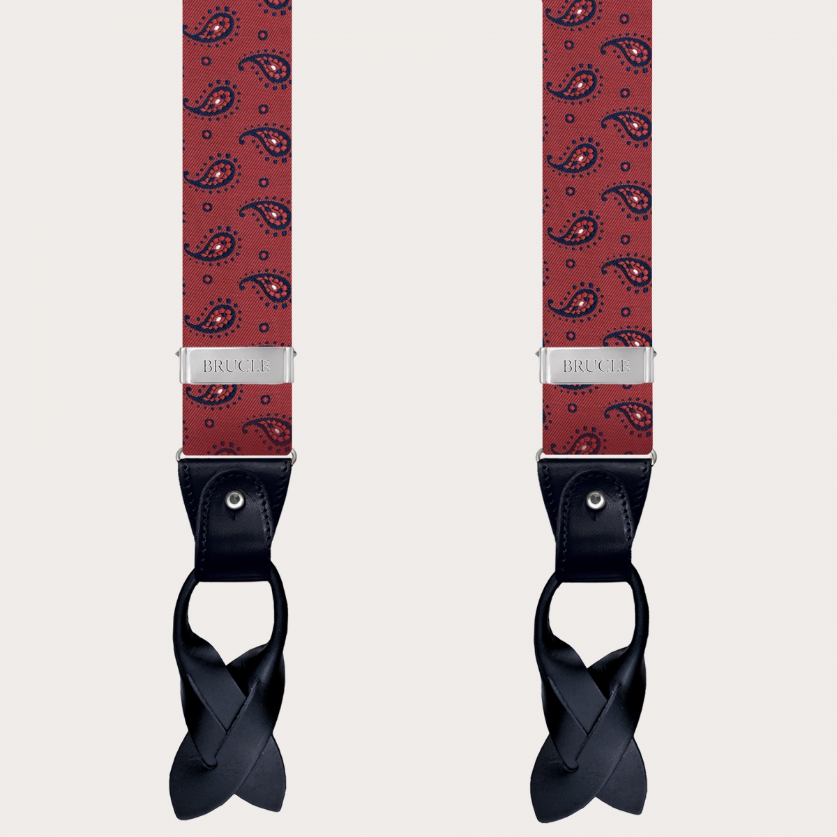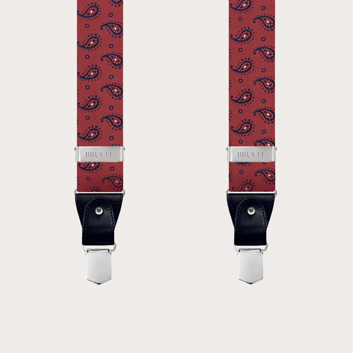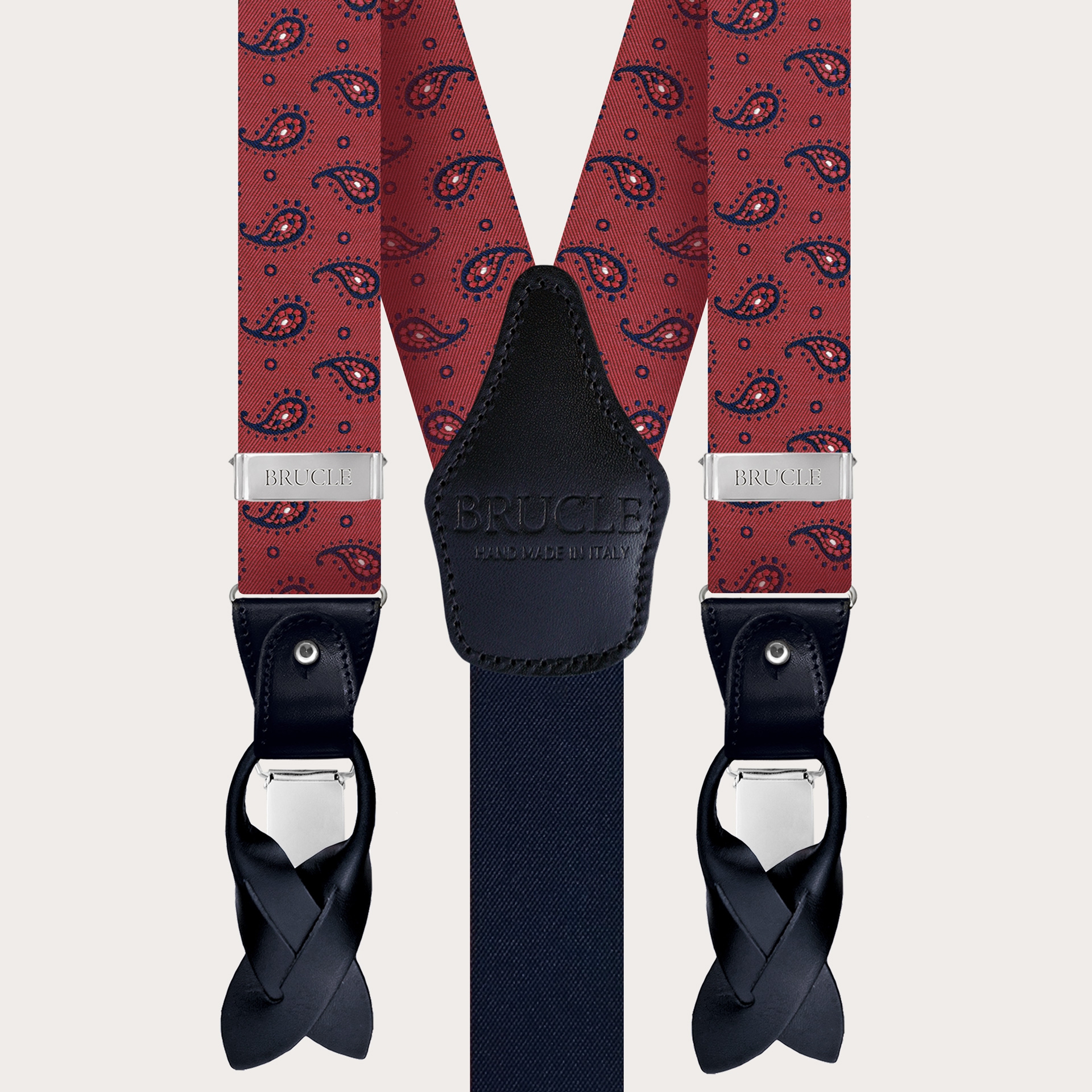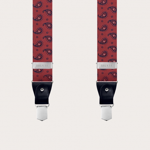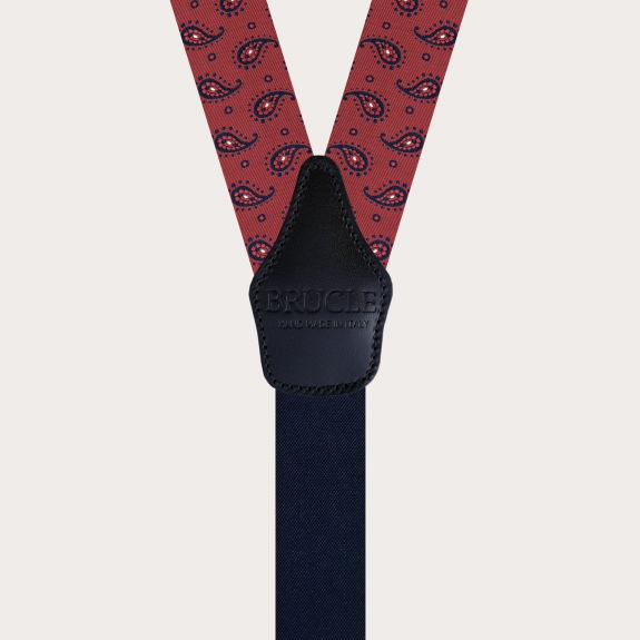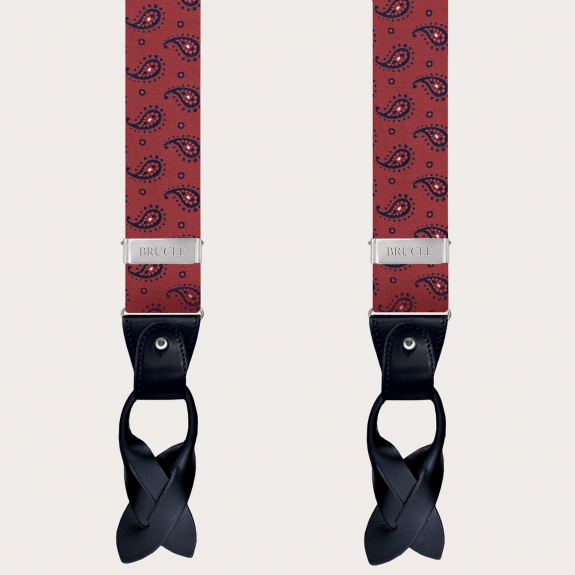 Explore the innate elegance of men's suspenders in fine burgundy paisley silk, a symbol of luxury Made in Italy. Handcrafted in Italy, these silk suspenders embody artisanal mastery in the field of manufacturing. Produced with pure 99-thread silk woven in Como, a globally recognized hub of silk weaving, these suspenders enhance the sophisticated paisley design and are completed with hand-colored and shaded leather details.