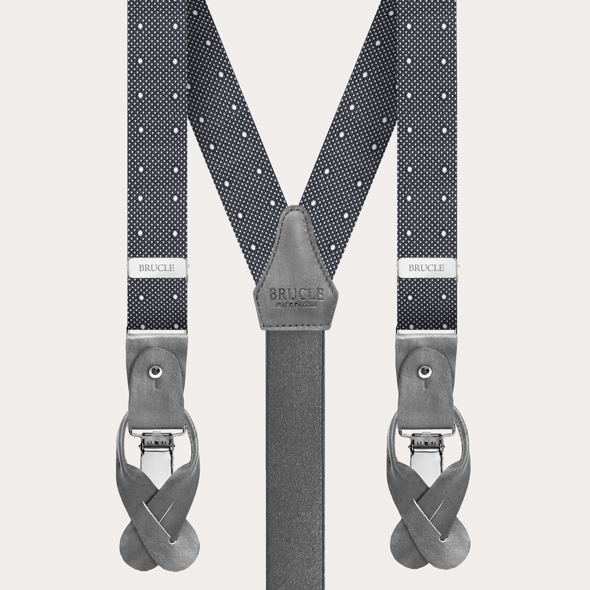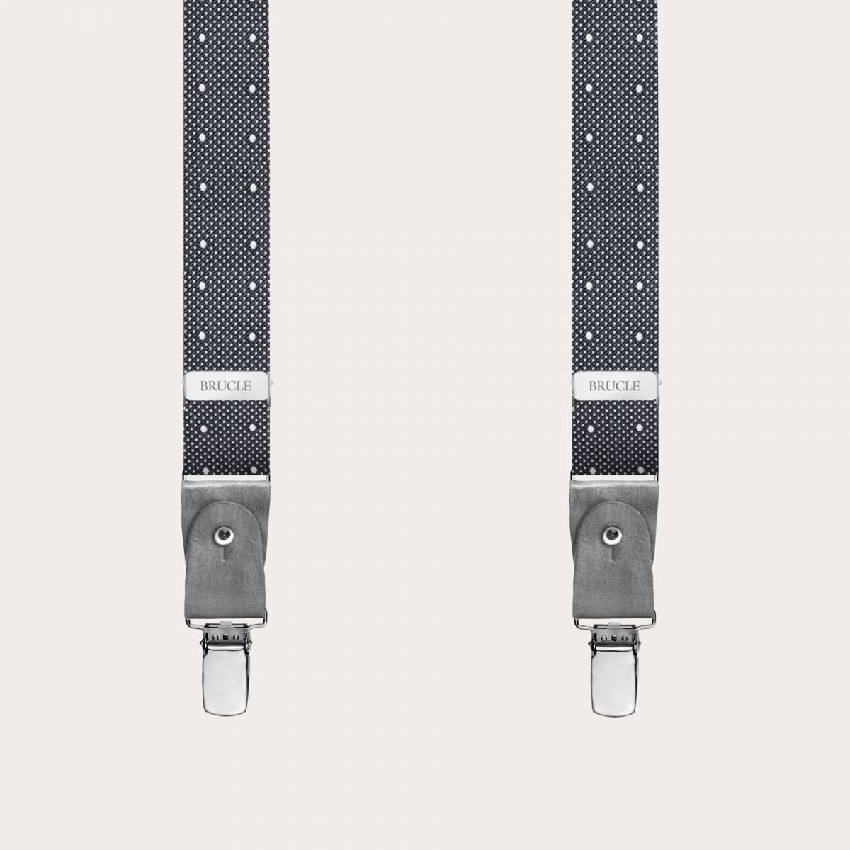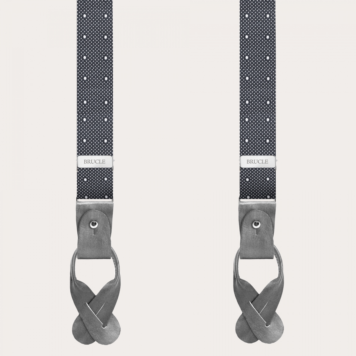 Our blue silk suspenders for buttons are perfect for those looking to add a touch of style and elegance to any formal outfit. The blue color lends itself perfectly to many combinations, offering an alternative to the classic navy blue.