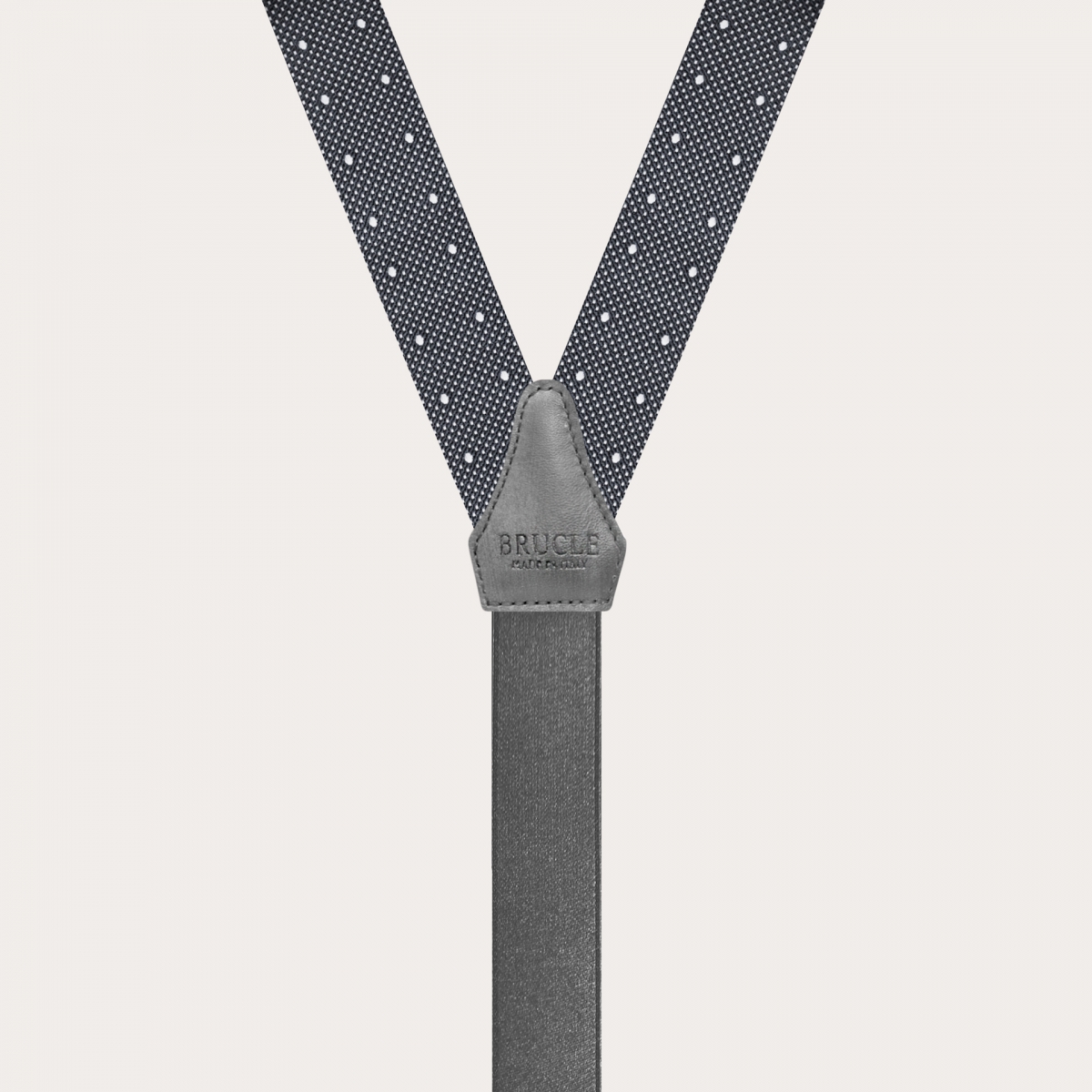 These blue silk suspenders for buttons are customizable with engravings on the leather parts, making them even more unique.