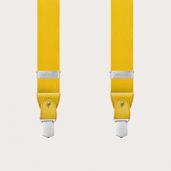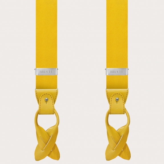 Original yellow silk suspenders for men handmade in Italy. Crafted with high-quality jacquard silk woven in Como and with hand-colored leather parts, these yellow suspenders are capable of elevating any look.