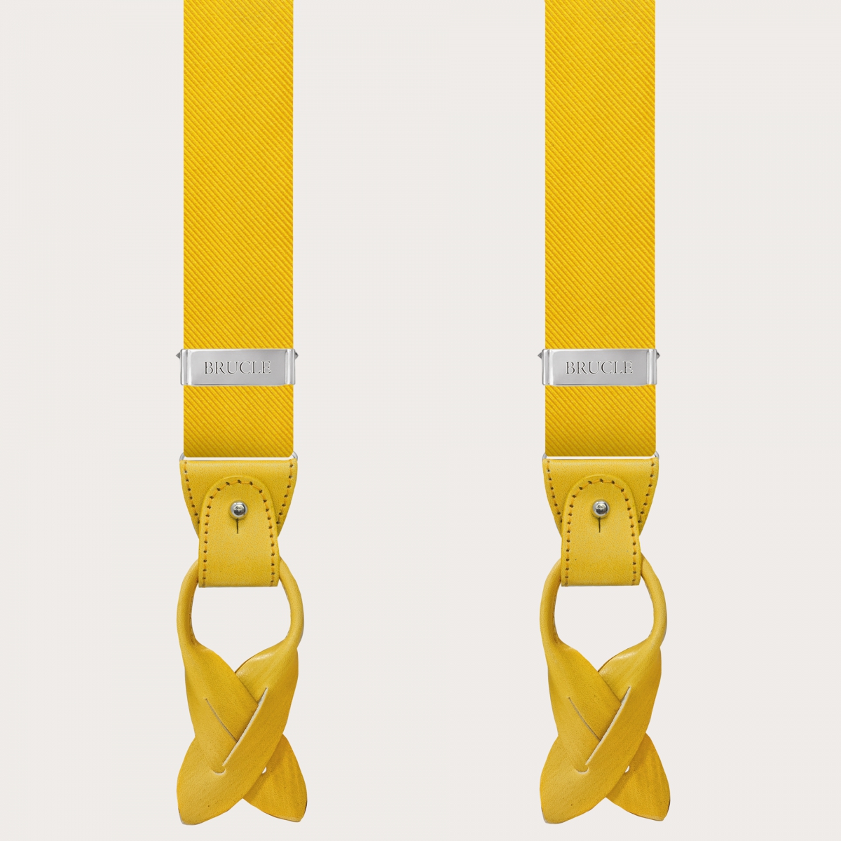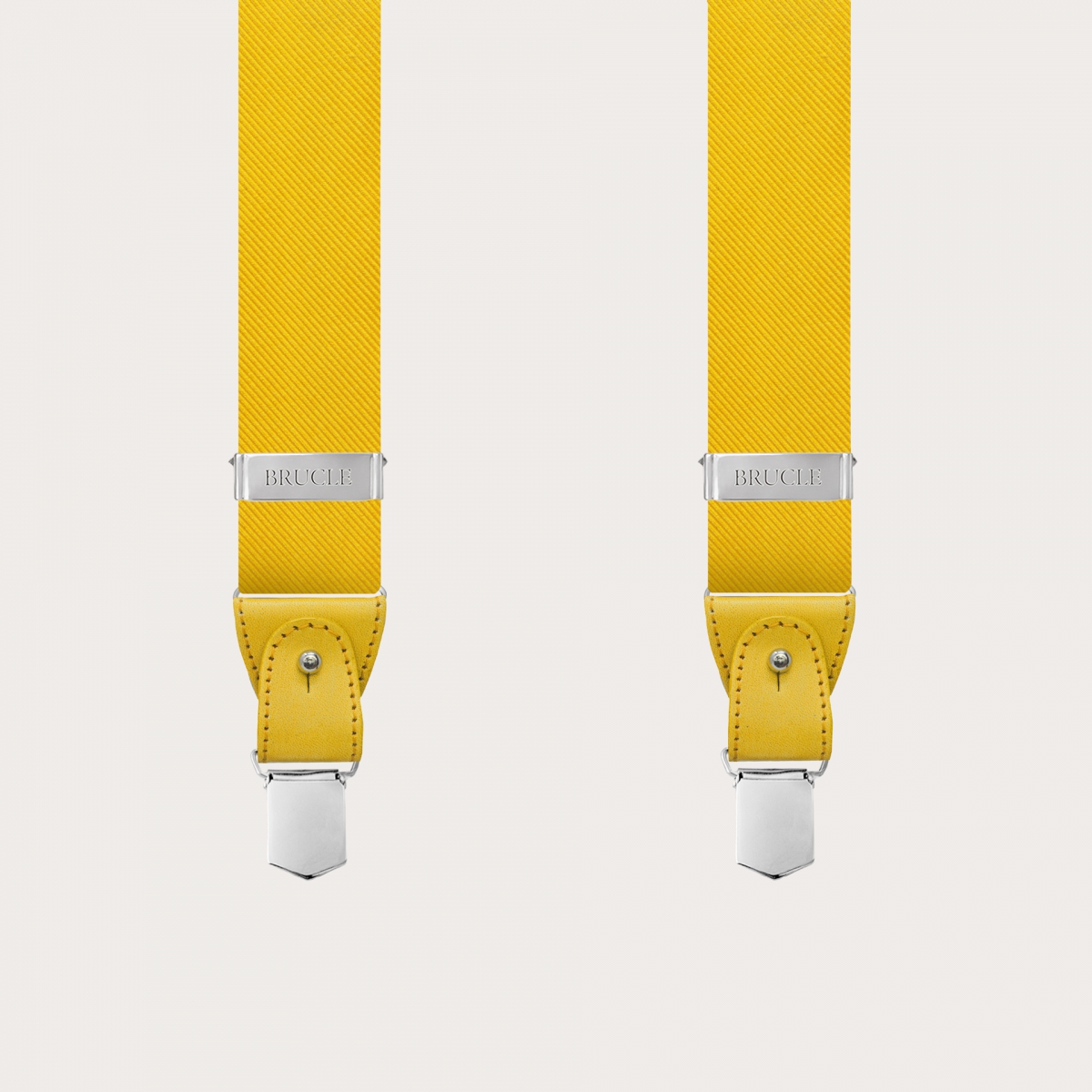 The men's yellow silk suspenders are dual-use: they can indeed be worn with buttons or with clips, perfectly adapting to your style and needs. They are provided complete with all necessary accessories, except for the button set, often already present in the trousers. Available to match with the tie, both wide and narrow, or with the bow tie, the Brucle yellow suspenders allow you to create a coordinated look. In addition, the matching pocket square is also available. Every detail has been thought to guarantee a superior quality product, from the use of fine materials to the nickel-free finish, ideal for those who have allergies to metals. Like all Brucle suspenders, the yellow ones can also be made to measure and customizable with engravings on clips and leather parts.