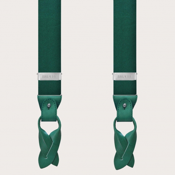 These men's silk suspenders in green are practical and versatile: they can indeed be worn with buttons or clips, perfectly adapting to your style and needs. Designed to be comfortable and durable, these suspenders are an elegant and refined accessory. Available in combination with a pocket square, a tie, or a bow tie, Brucle's suspenders allow you to create a coordinated and sophisticated look. Every detail has been thought of to guarantee a superior quality product, from the use of premium fabrics to the hand-dyed leather and nickel-free finish, ideal for those allergic to metals.
