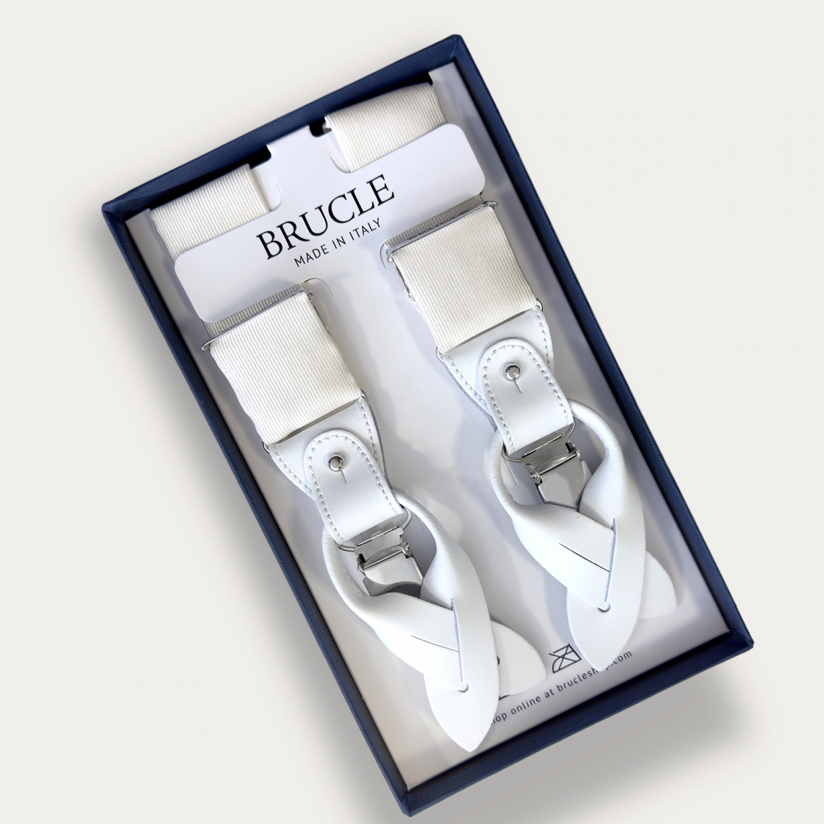 Jacquard silk white suspenders, perfect for events, ceremonies, tuxedos. Finished with genuine leather parts, they can be worn with leather ends for buttons or with clips. The front legs are adjustable, while the rear leg is elastic to ensure a perfect fit. Like all Brucle suspenders, the silk suspenders can be customized with engravings, or by changing the color of the leather accessories.