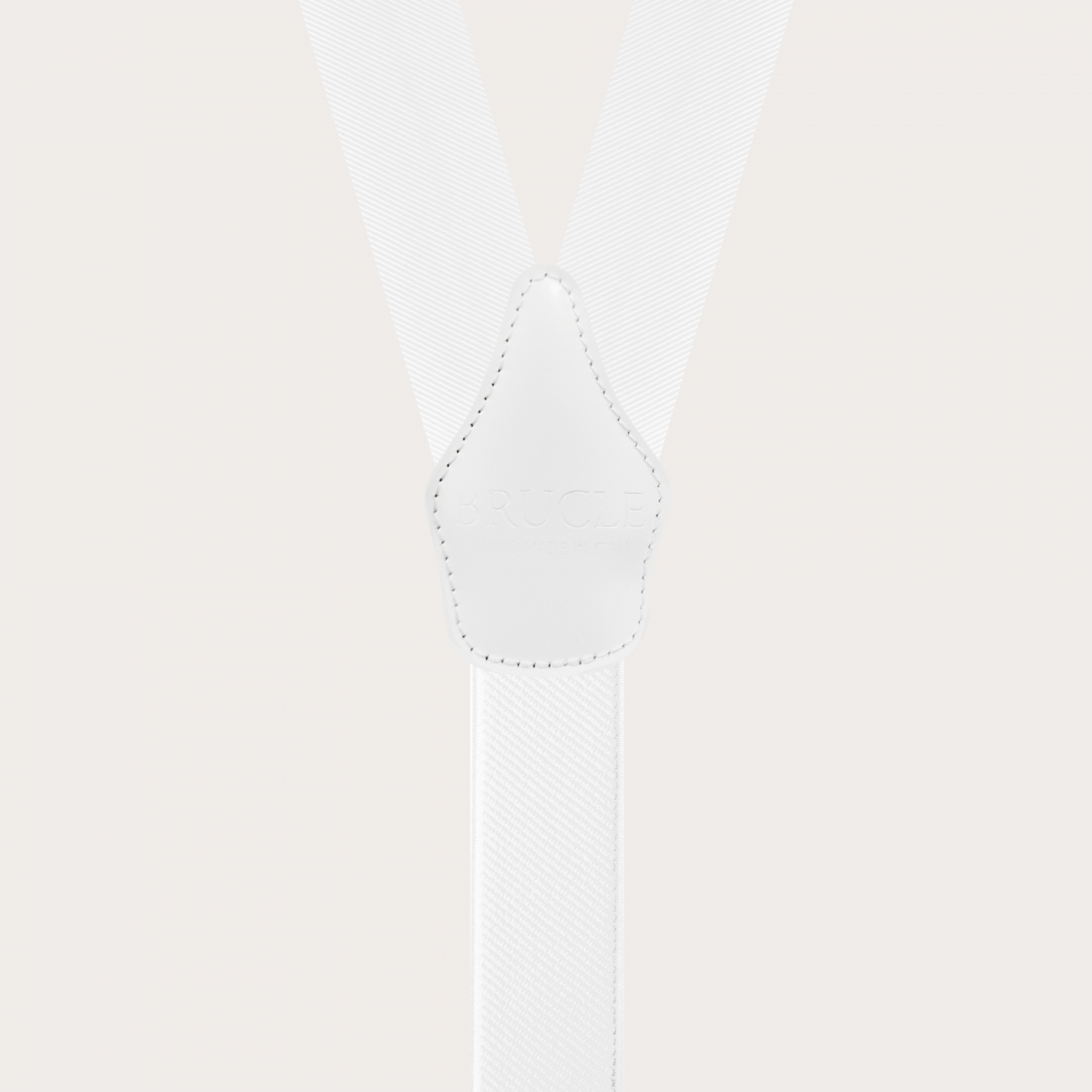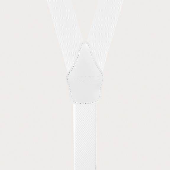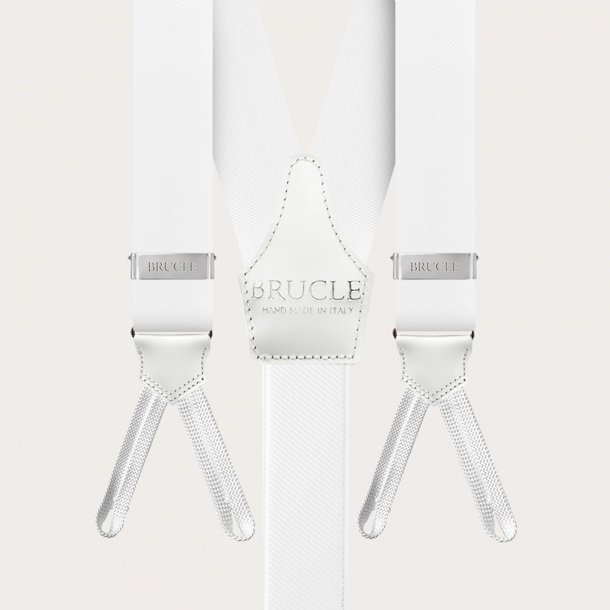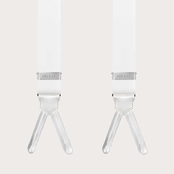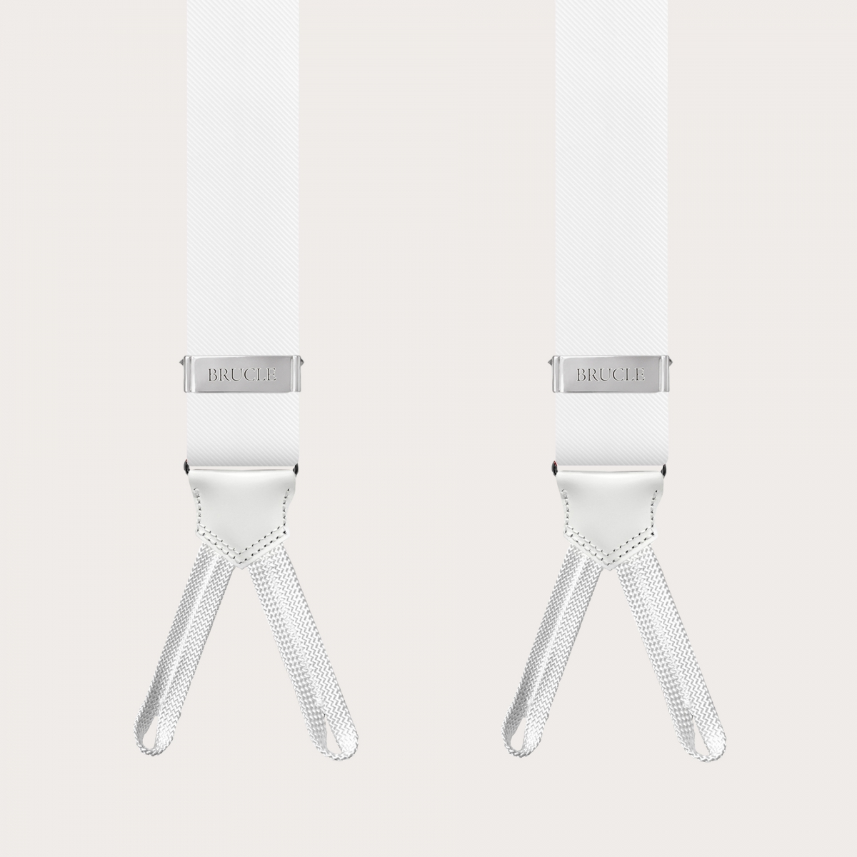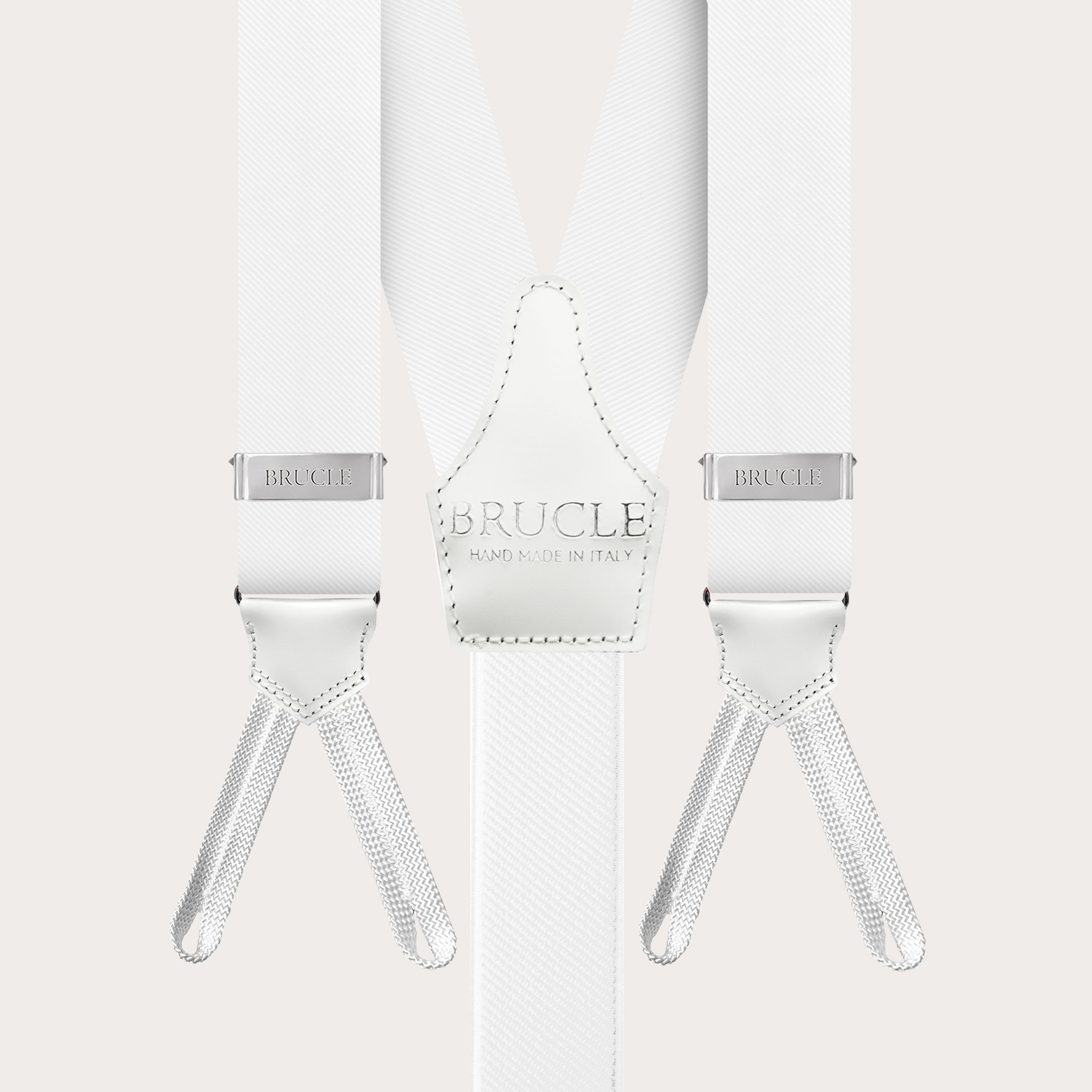 Elevate your style with the BRUCLE white silk suspenders with braid ends.