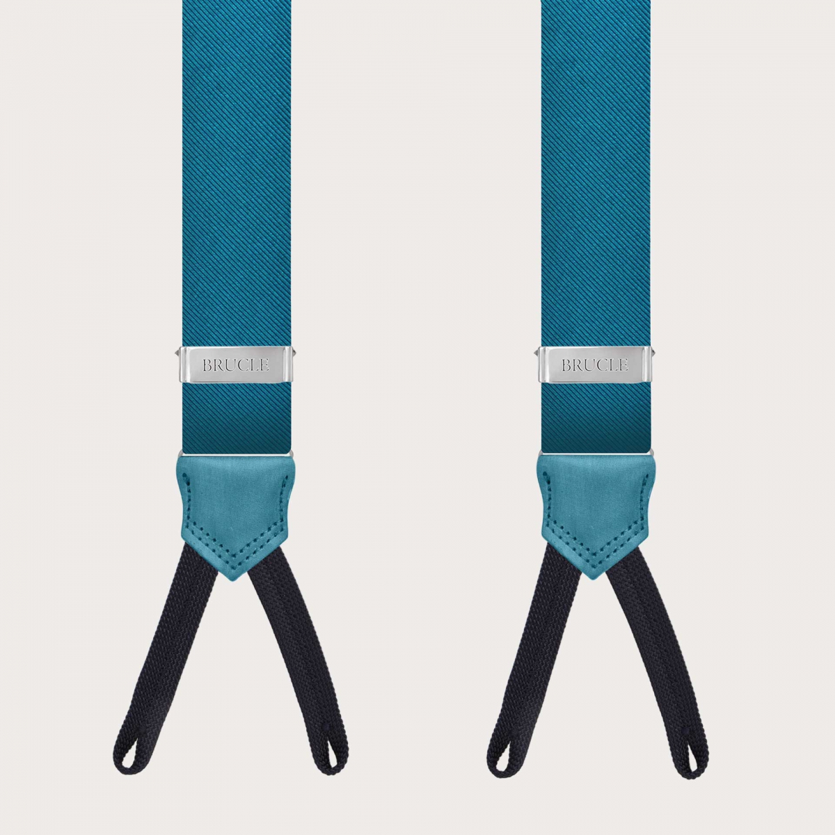 Our petrol green suspenders with buttonholes can be worn only with buttons for a sophisticated total look with a touch of British charm. The intense color makes them ideal for those who want to stand out with taste. Every detail has been taken care of to ensure a product of superior quality, from the use of 74-thread silk woven in Como, to the finishes in genuine hand-colored leather and the use of nickel-free small metal parts, perfect for those who have allergies to metals.