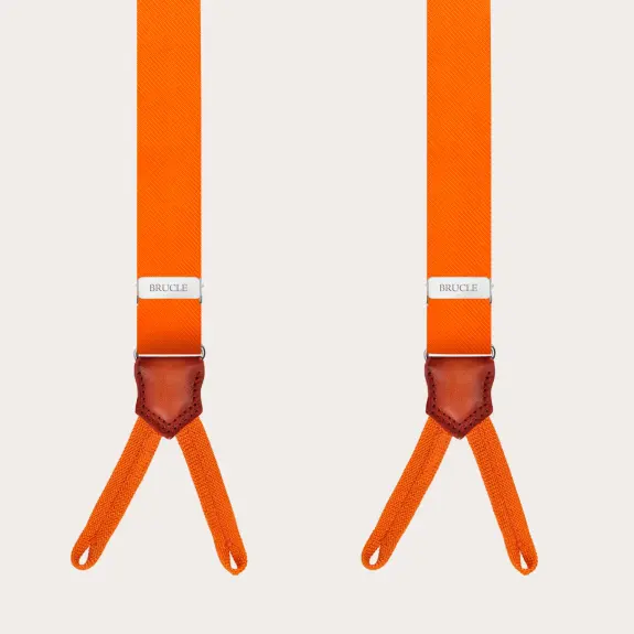 Handcrafted in Italy with high-quality 74-thread silk woven in Como, these orange suspenders for buttons offer a lively and sunny look, with a surprising color.