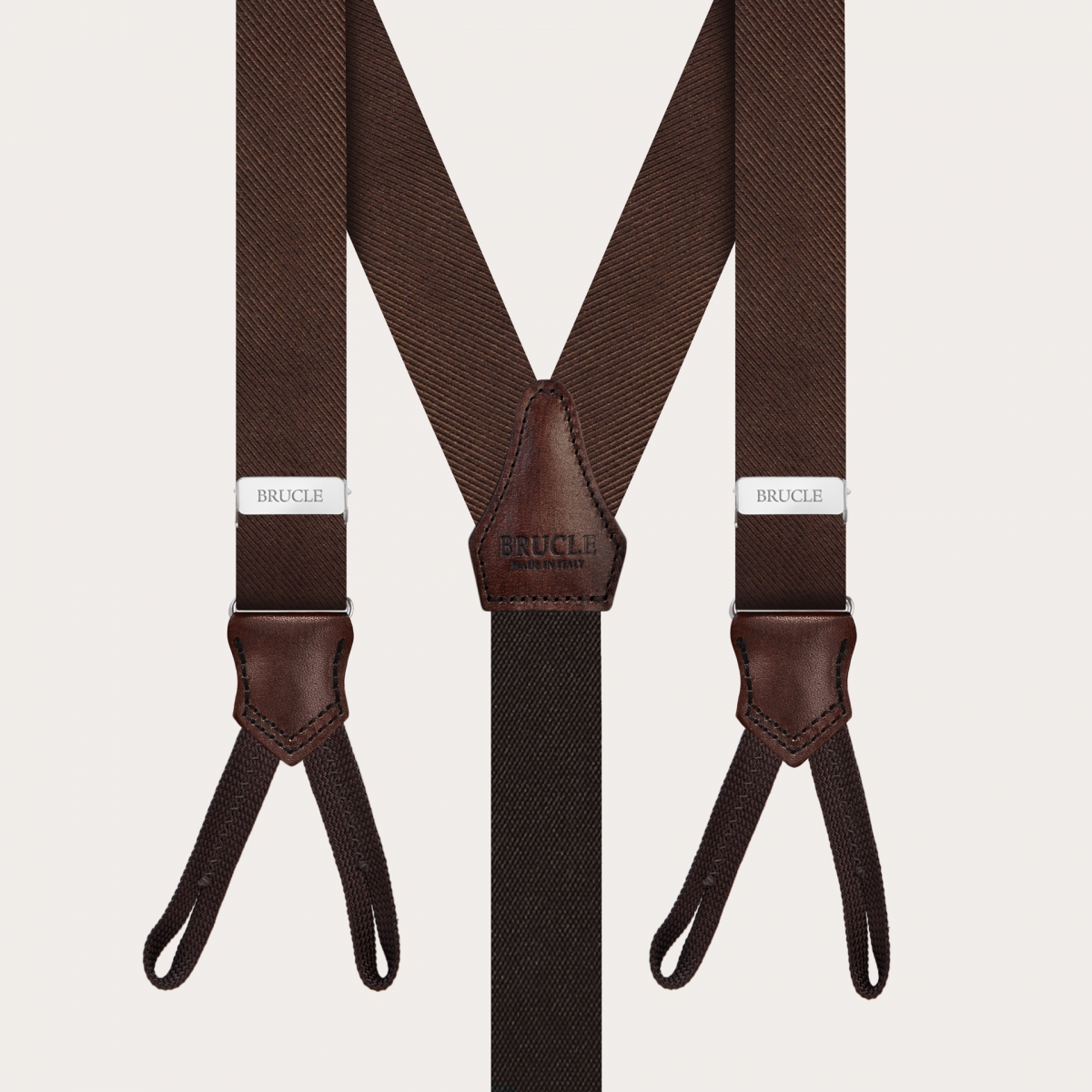 Men's suspenders Brucle: distinctive and refined. Our narrow brown suspenders with buttonholes are a symbol of Italian elegance. Crafted in luxurious jacquard silk and enriched with hand-colored leather details, these suspenders merge tradition and modernity.