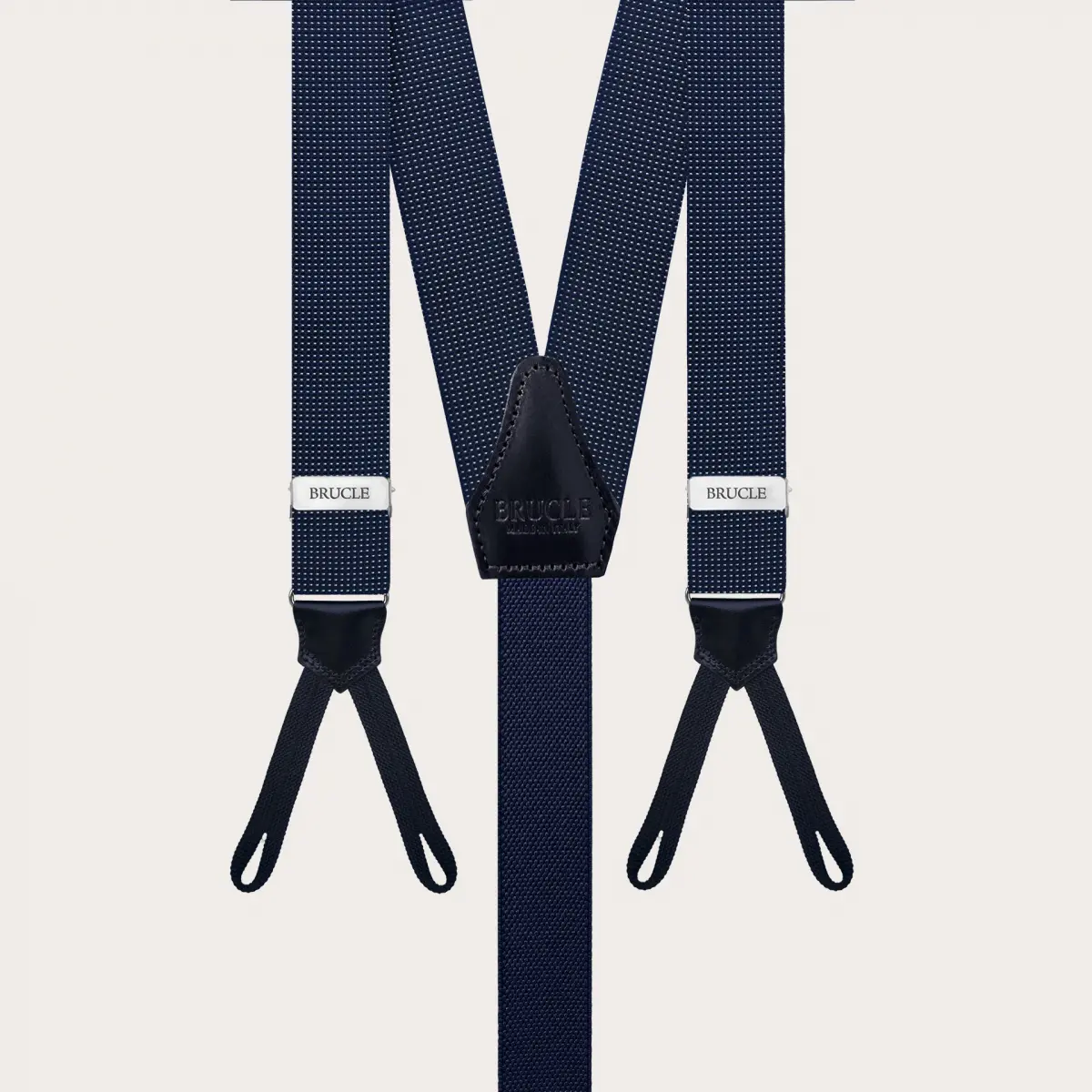 These blue suspenders are entirely handmade in Italy with the finest materials, and attention to every detail.