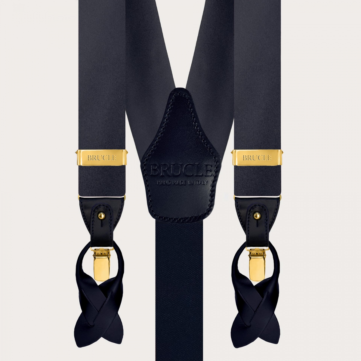 Men's navy blue satin silk suspenders: a classic model, perfect for ceremonies and formal events, crafted with the utmost attention to detail. Customizable with engravings.