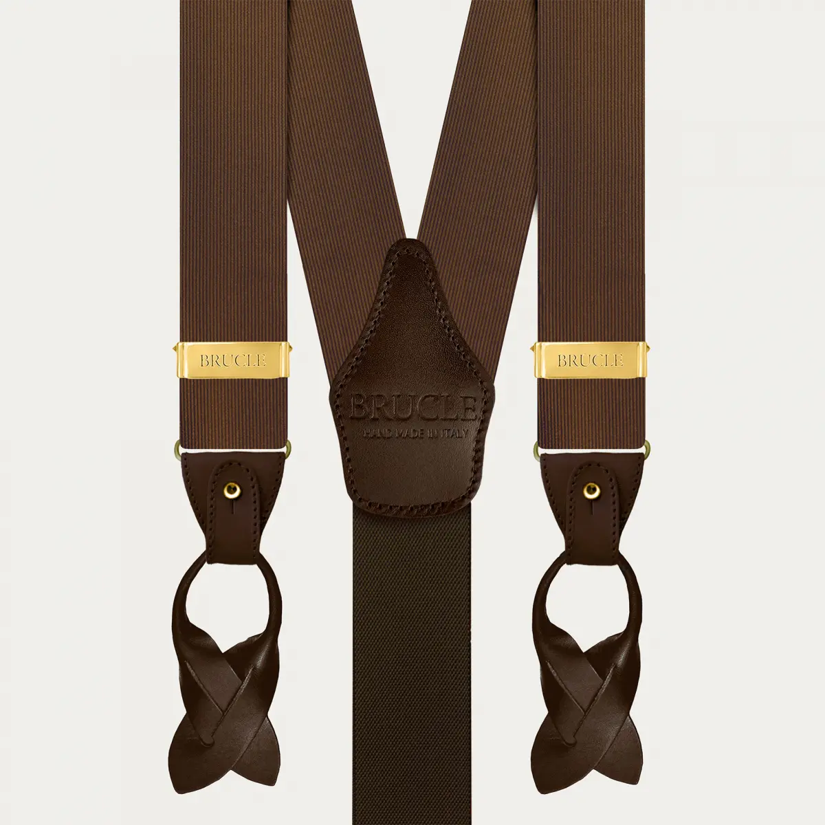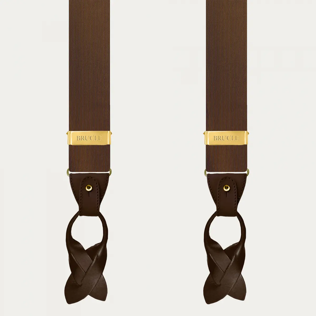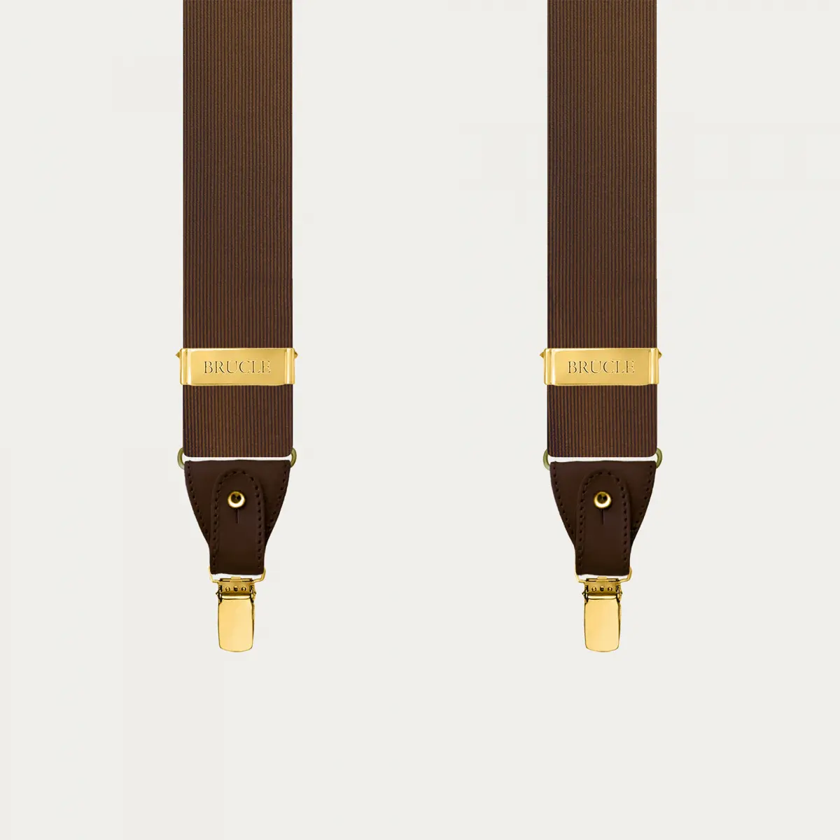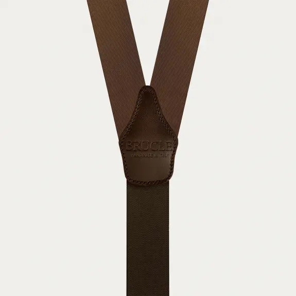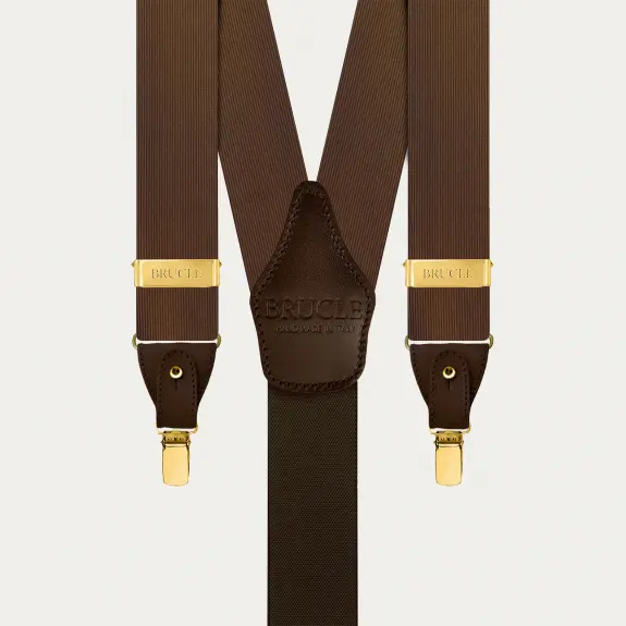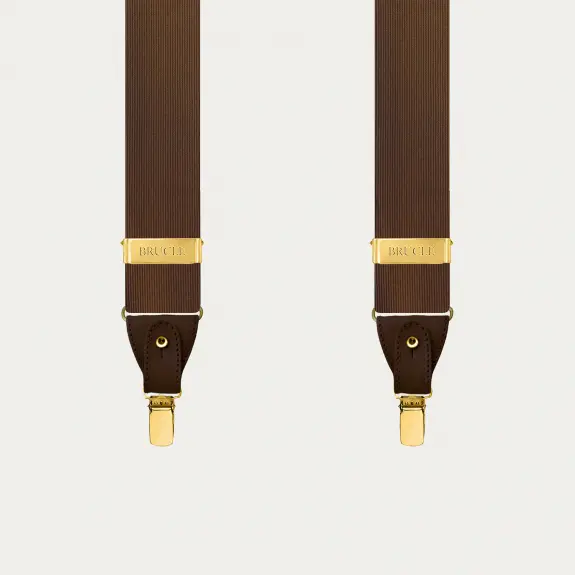 Elegant brown silk suspenders with gold clips, ideal for a formal and refined look.