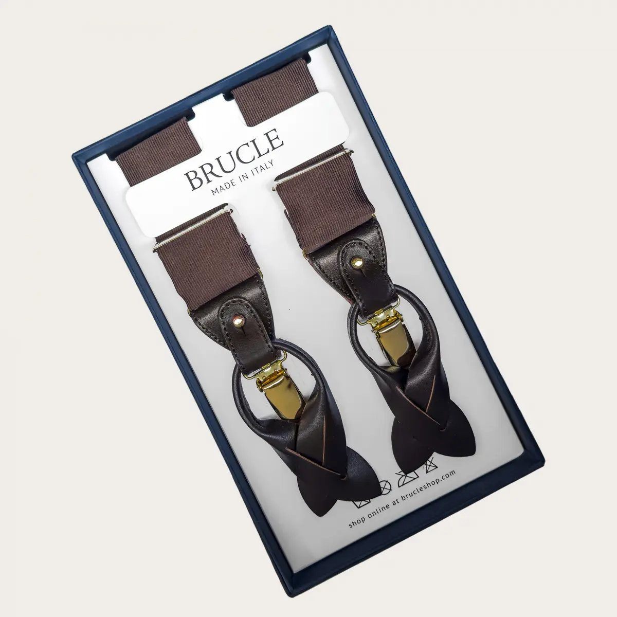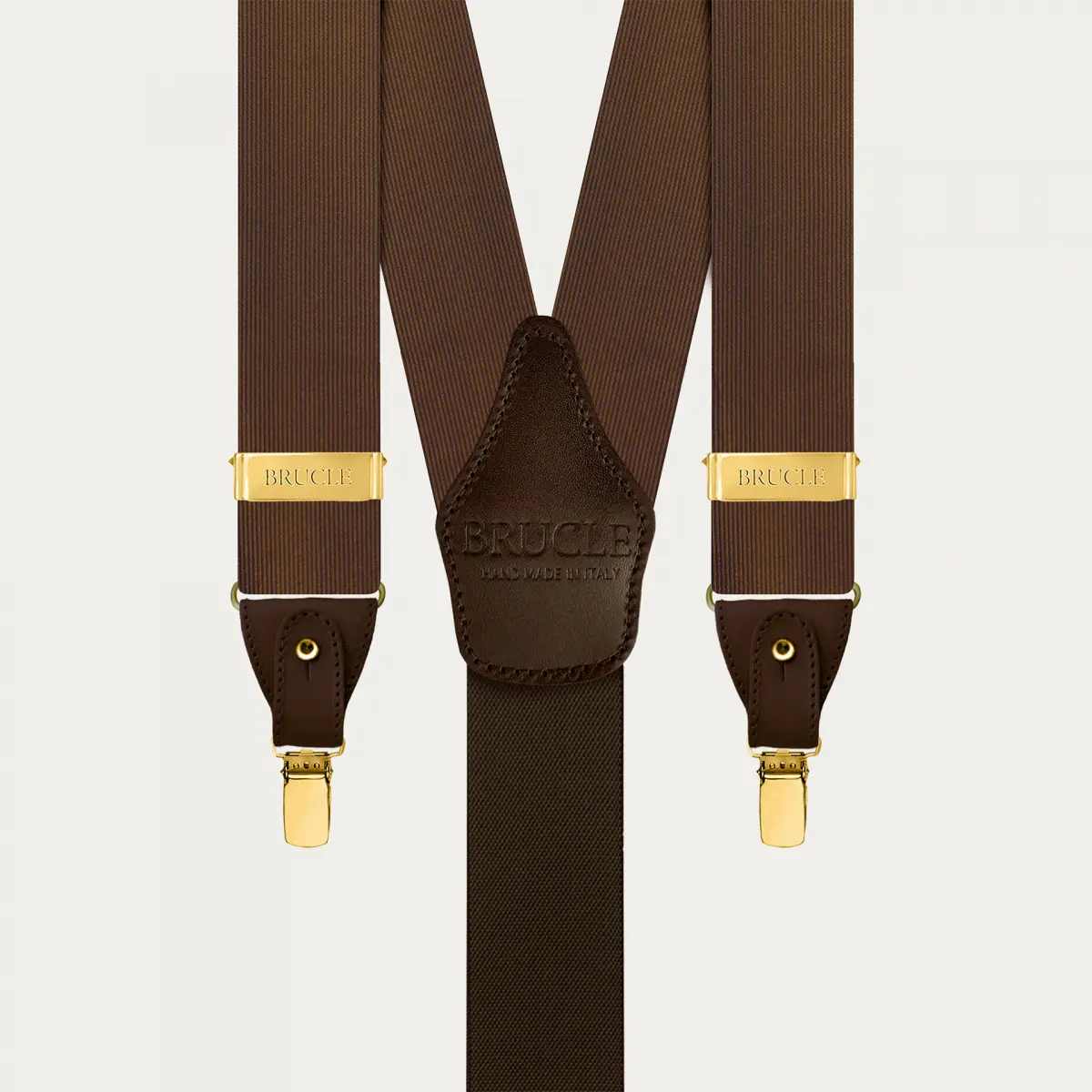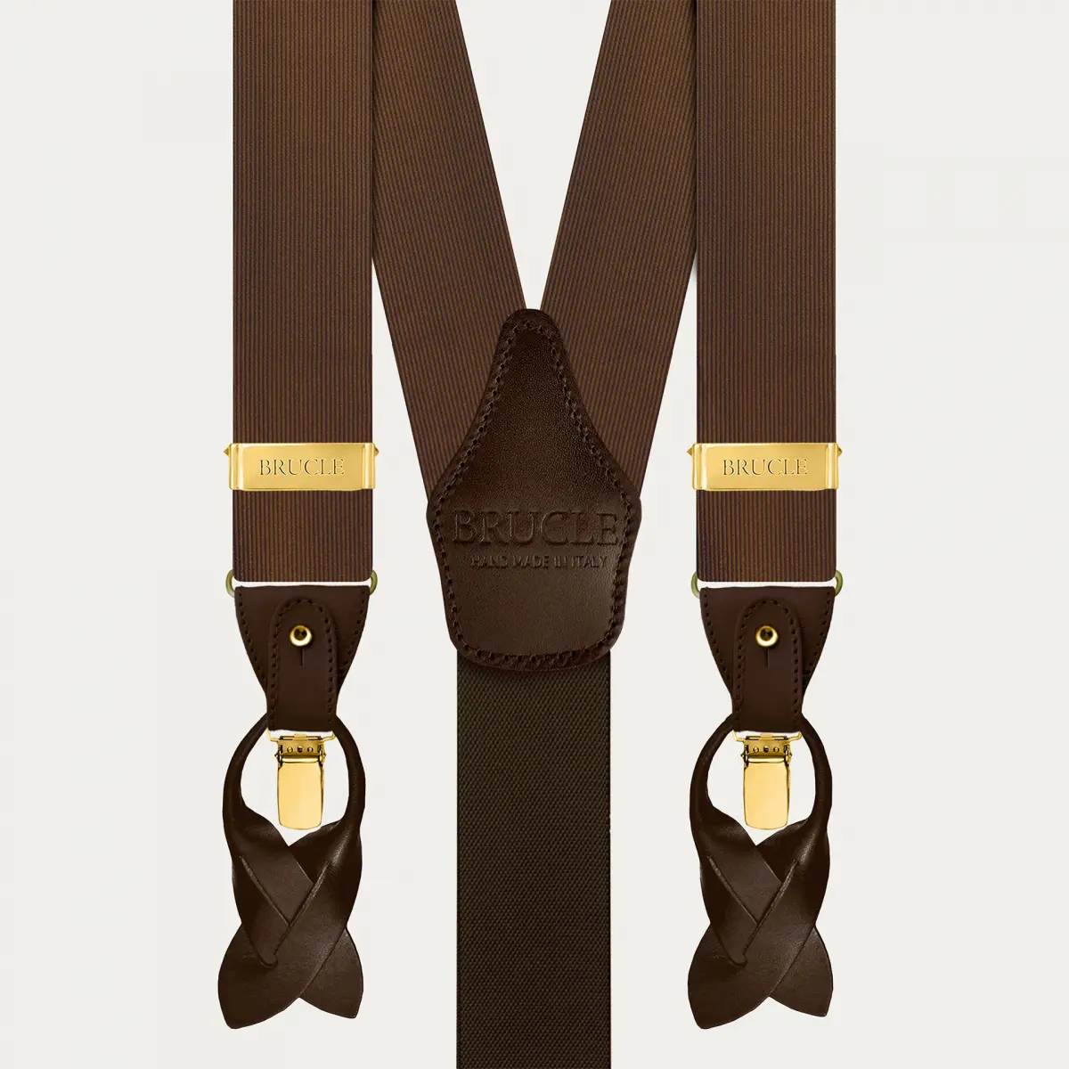 Elegant brown silk suspenders with gold clips, ideal for a formal and refined look.