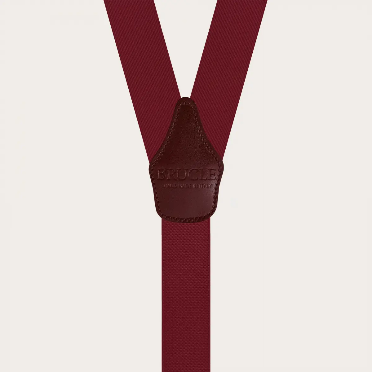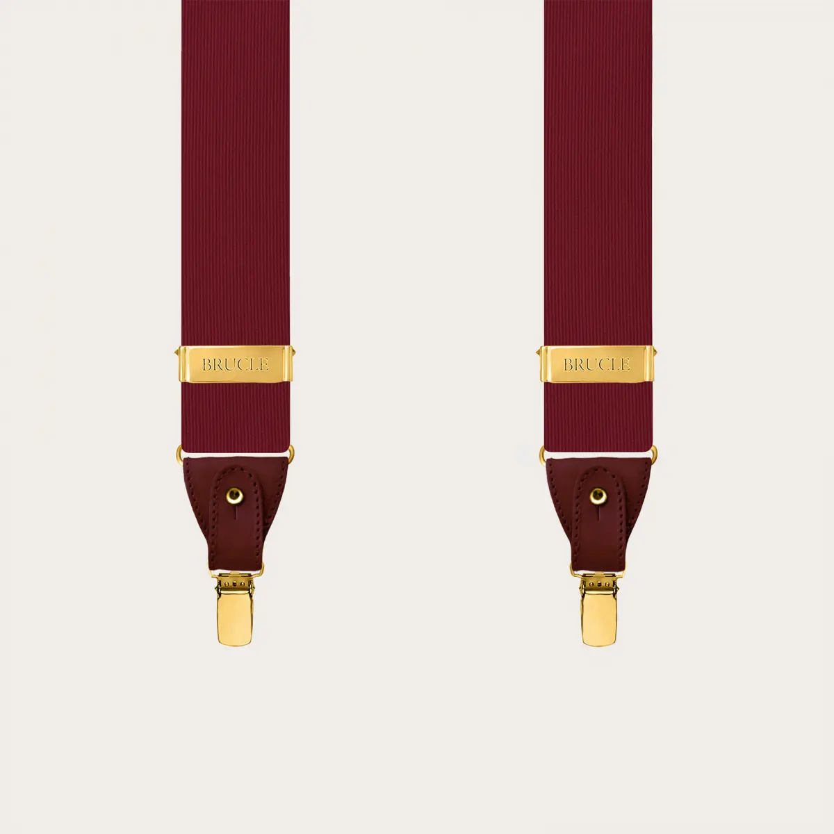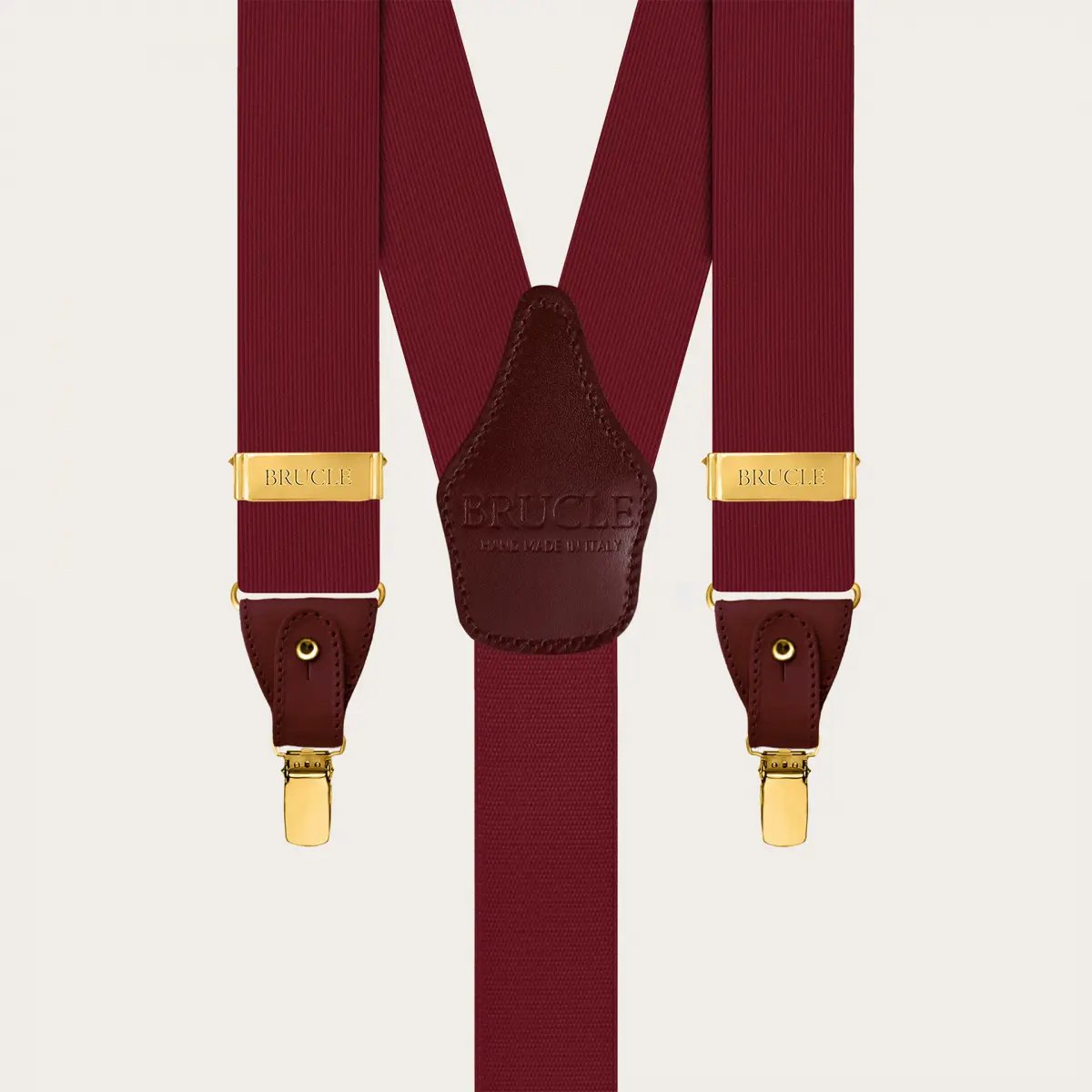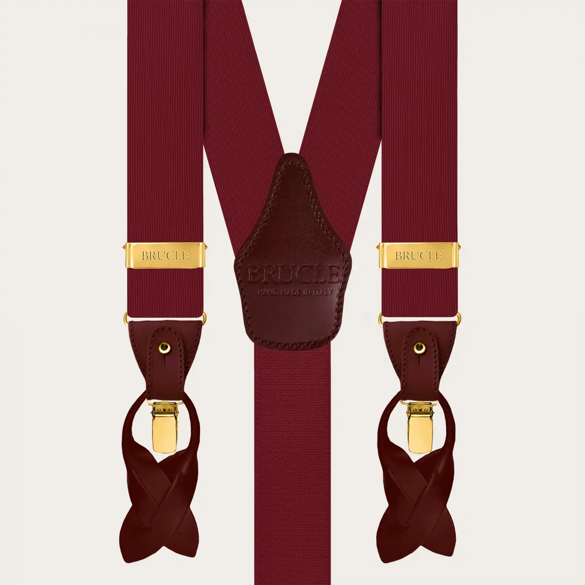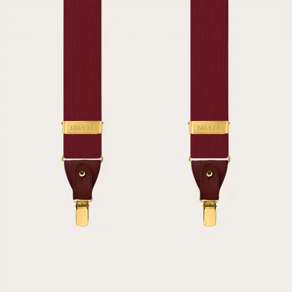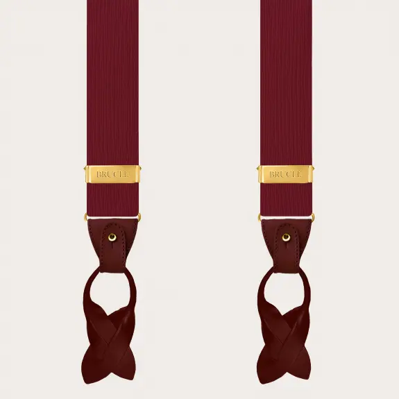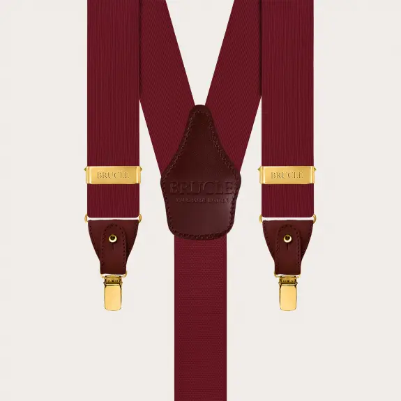 Refined burgundy silk men's suspenders with metallic parts and golden clips, perfect for enhancing a formal outfit with a touch of sophisticated elegance. These suspenders are entirely handmade in Italy, ensuring superior quality and unique versatility: they can be worn with buttons or alternatively with clips, suitable for all occasions.