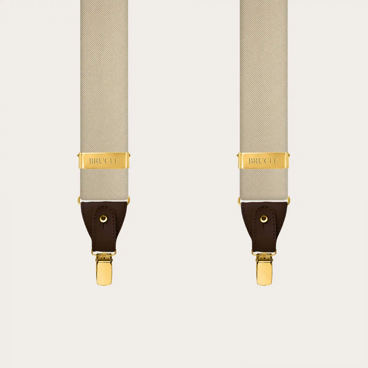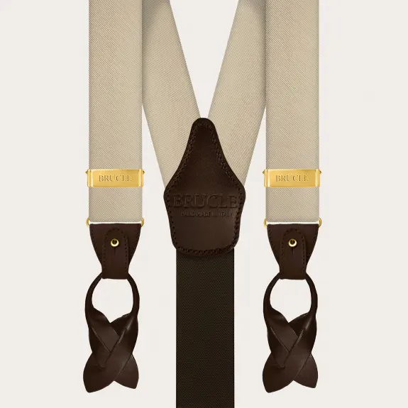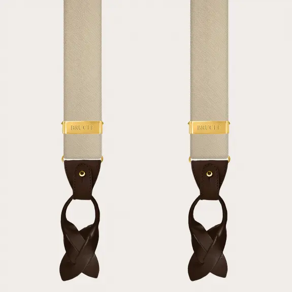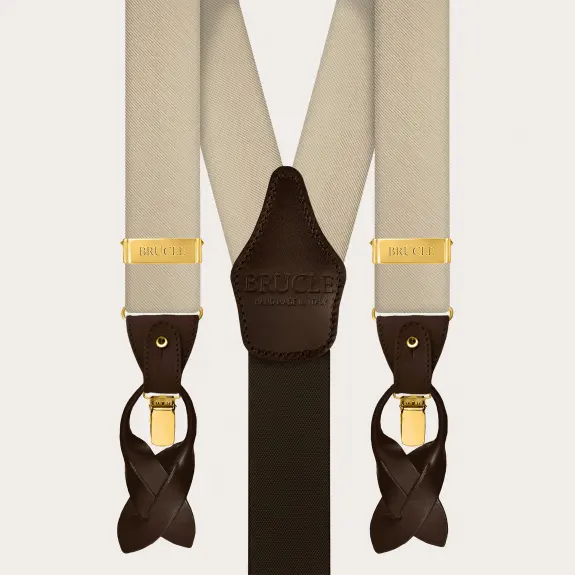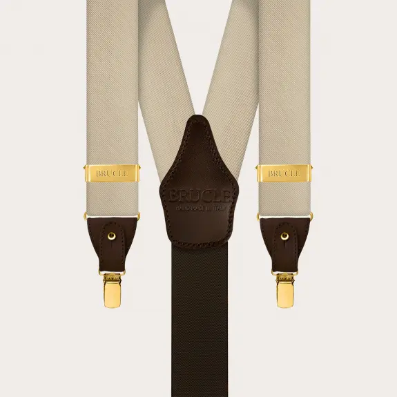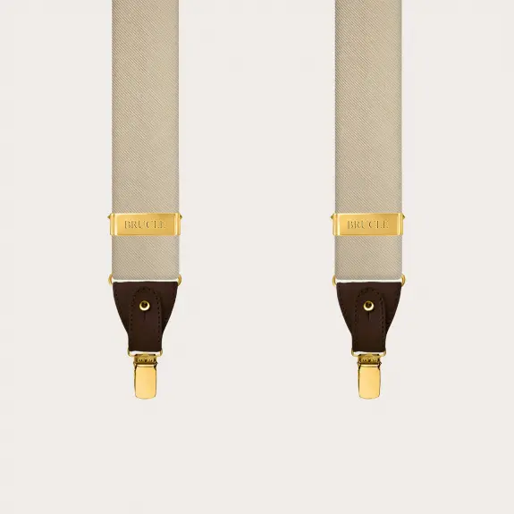 Men's champagne silk suspenders, enriched with clips and elegant gold metal parts: a symphony of refined tones that enhance the precious jacquard texture of the silk.