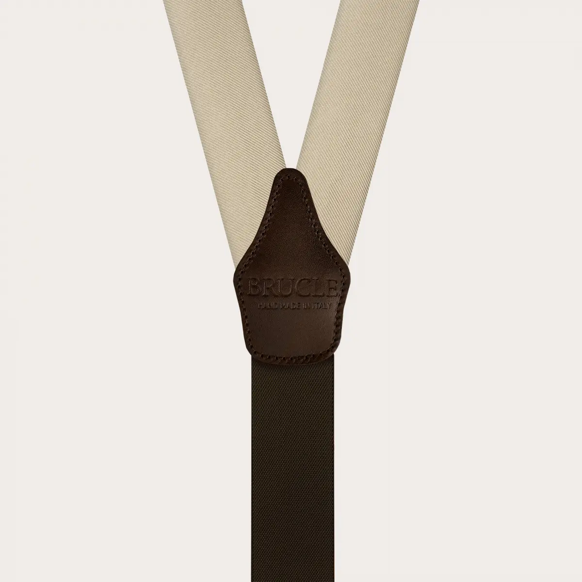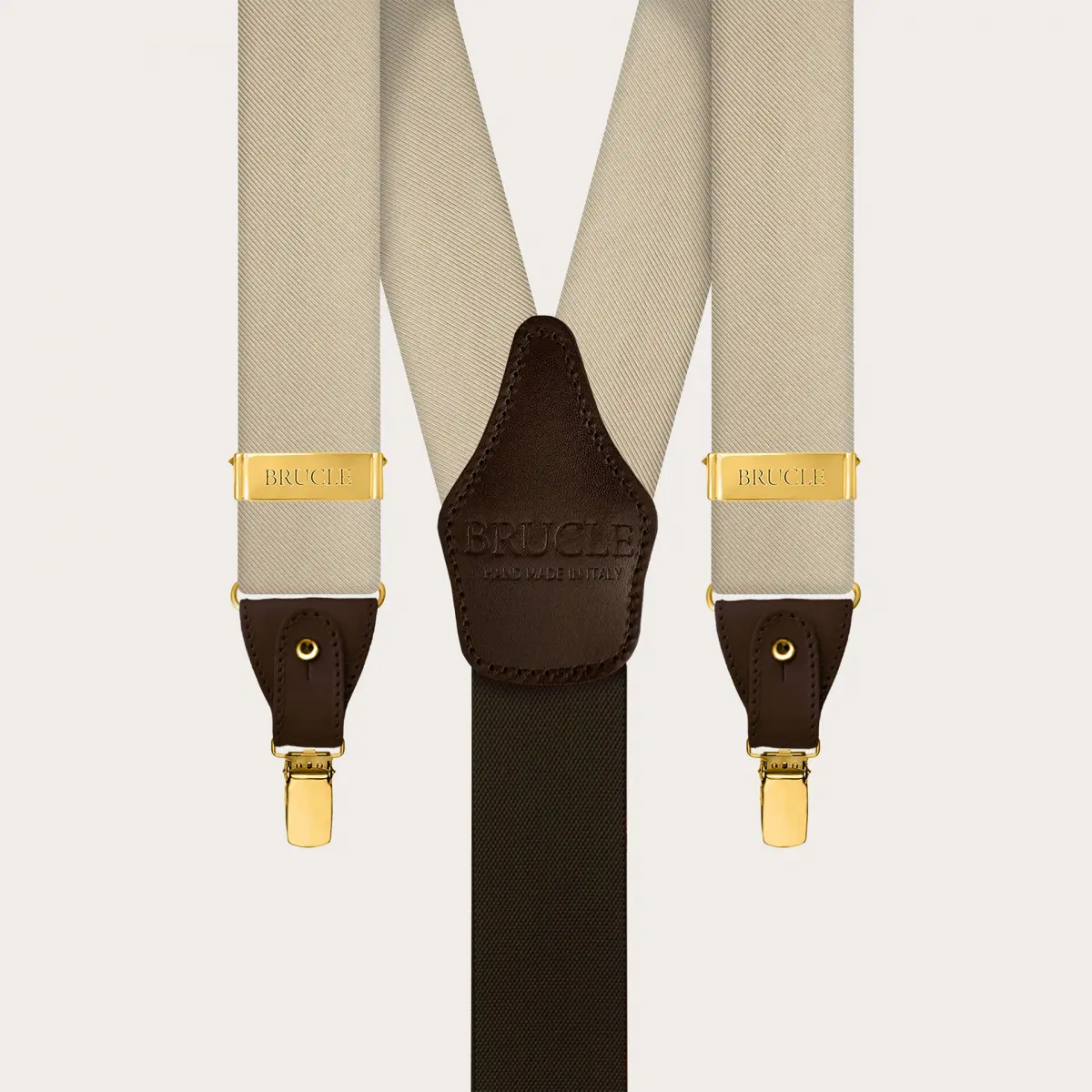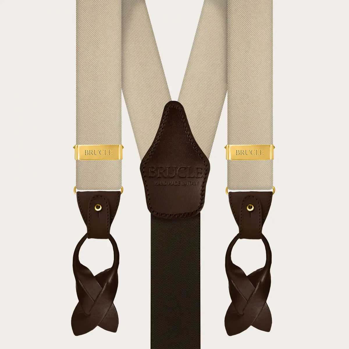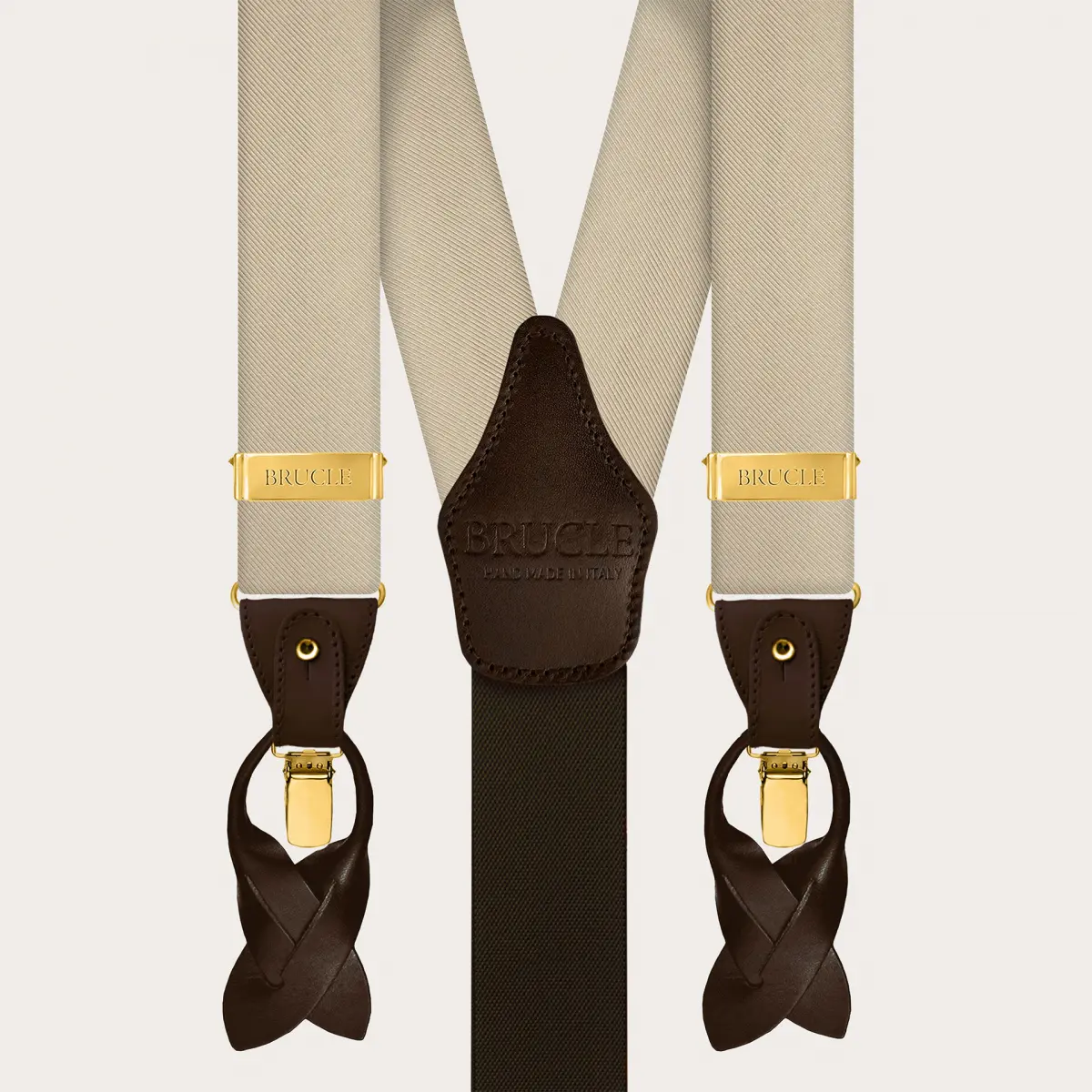 Handcrafted in Italy with the highest quality materials, the suspenders feature gold metal finishes and contrasting dark brown fine leather details.