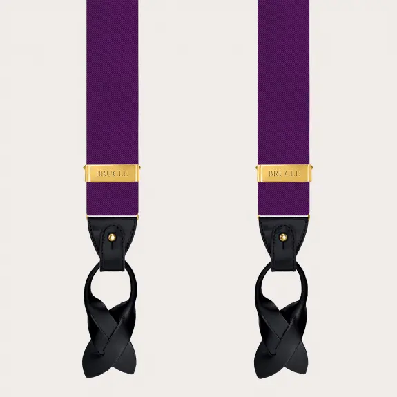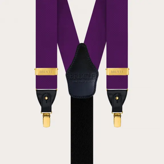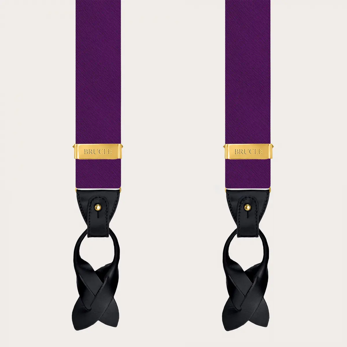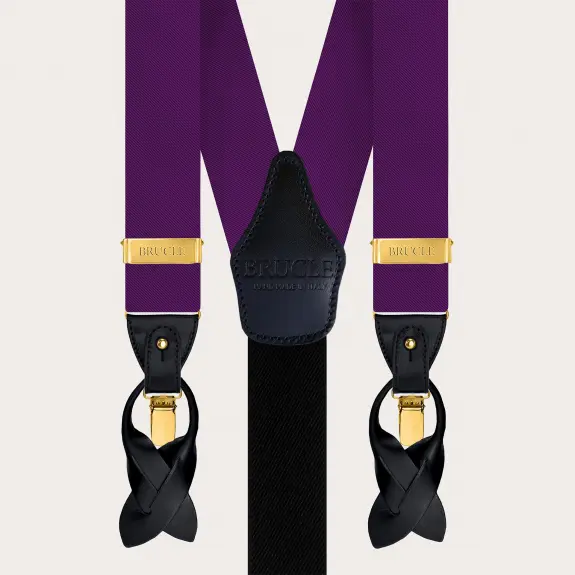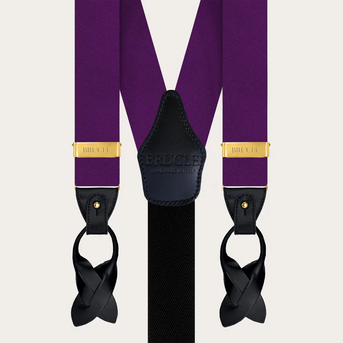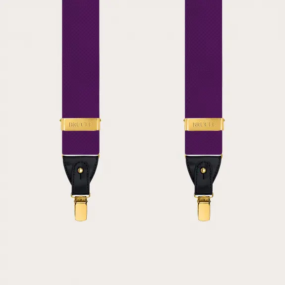 Discover the elegance of our purple silk suspenders with gold metal parts, a luxury accessory handcrafted in Italy.