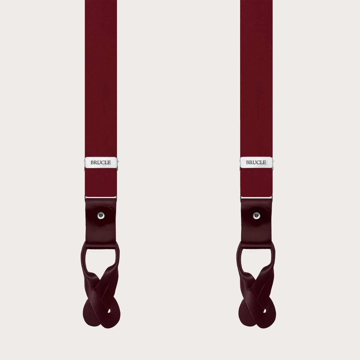 Tight Burgundy Satin Silk Suspenders dual use: versatile and practical, they can be used with leather mustache clips for buttons if you want an elegant look, or with practical clips for a more casual solution.