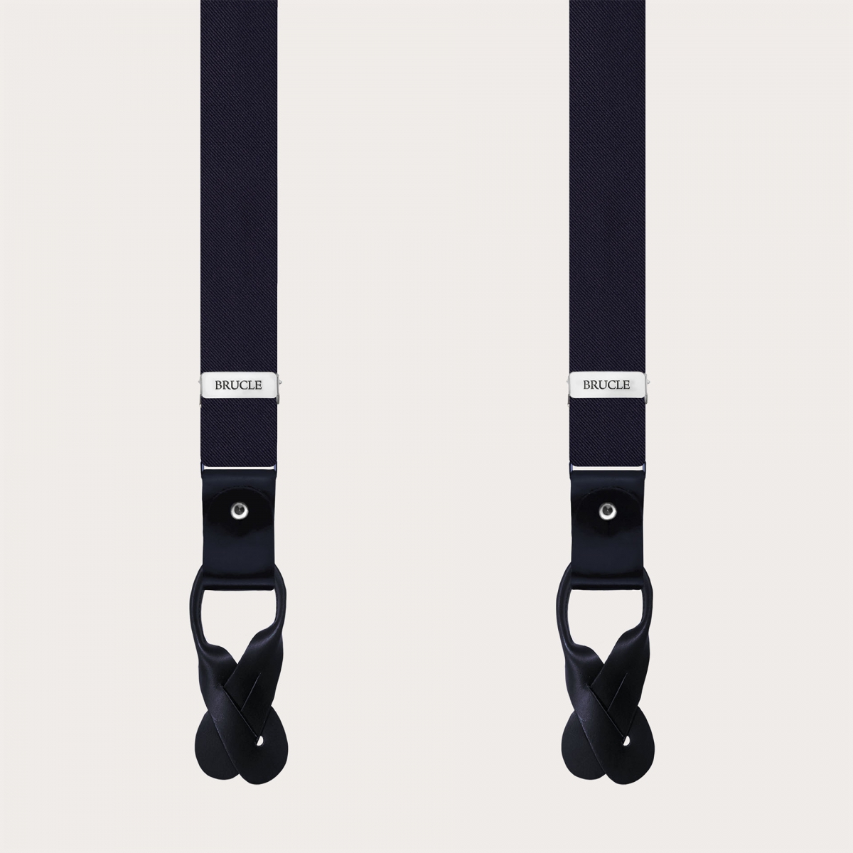 Narrow men's suspenders in navy blue silk satin, to be used with clips or leather loops for buttons.