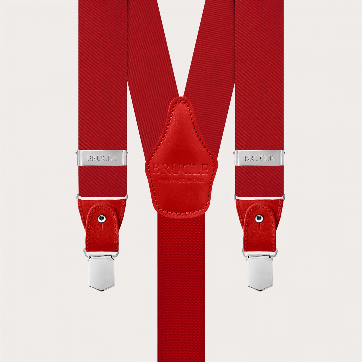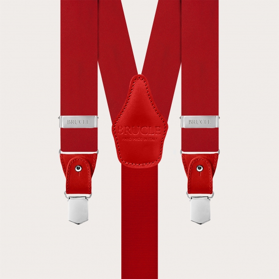 Men's red silk satin suspenders, to be used with leather loops for buttons or with clips. Entirely handmade in Italy with the finest materials, they are customizable with engravings on leather parts and clips. The vibrant shade of red is ideal for adding color to your look and pairs well with all shades of blue, gray, and black, making your outfit unique. Discover the coordinated silk accessories for a total look of elegance.