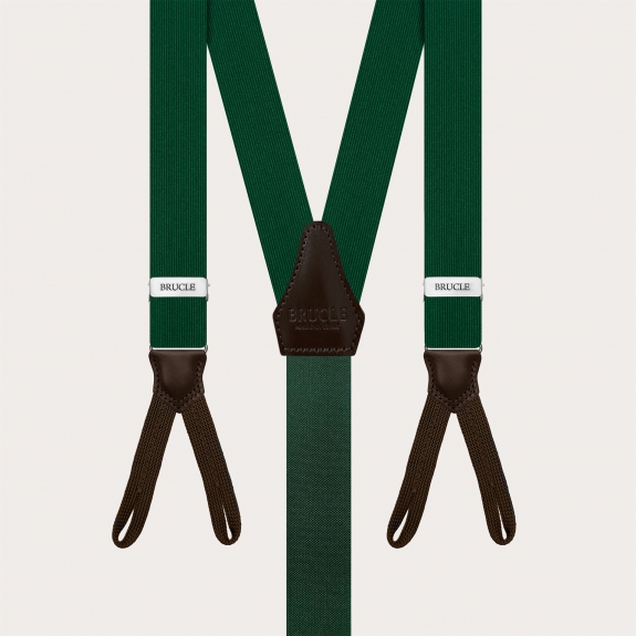 Men's green narrow suspenders with buttonhole attachment for button use. These thin green silk suspenders are particularly suitable for ceremonies, formal events, or elegant occasions, thanks to their unique and refined style.