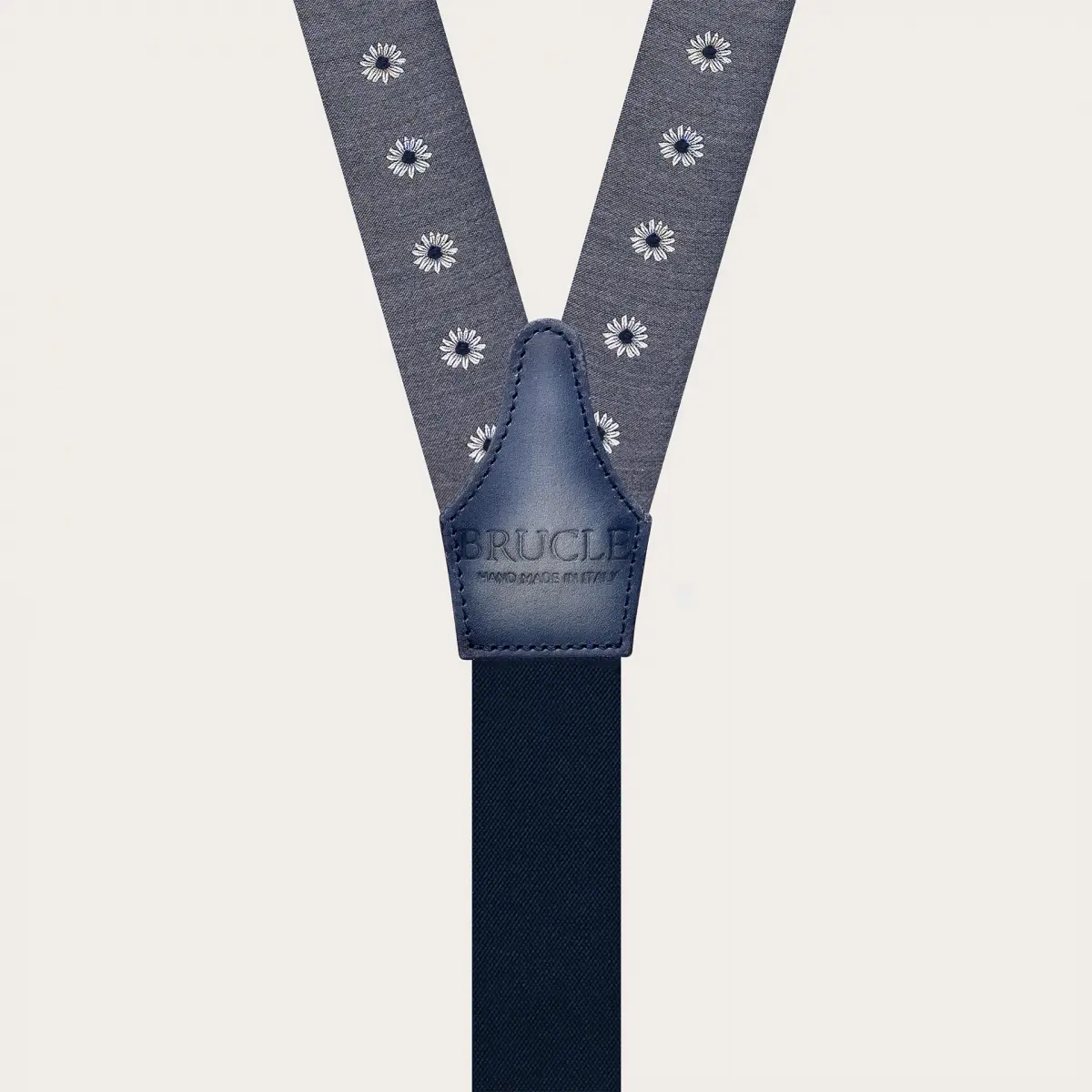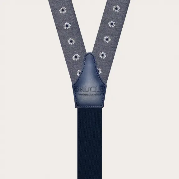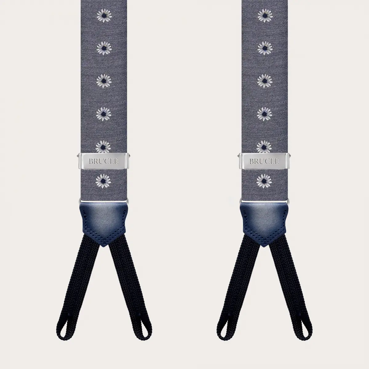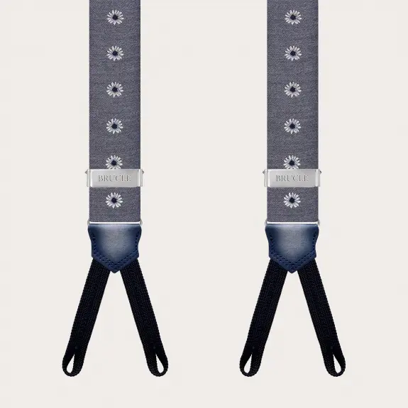 Elegant grey silk suspenders with a floral pattern, enriched by hand-dyed and hand-shaded leather parts.