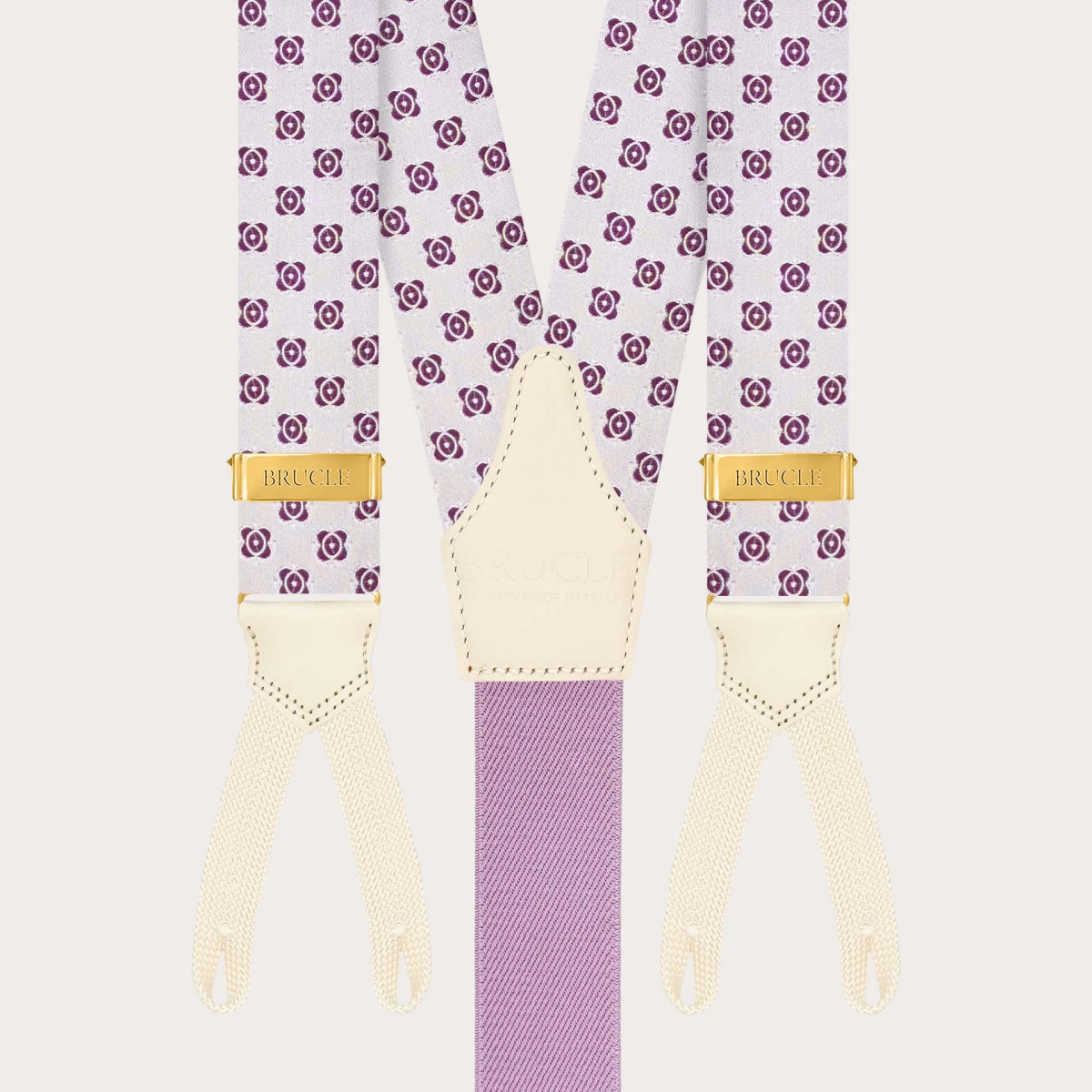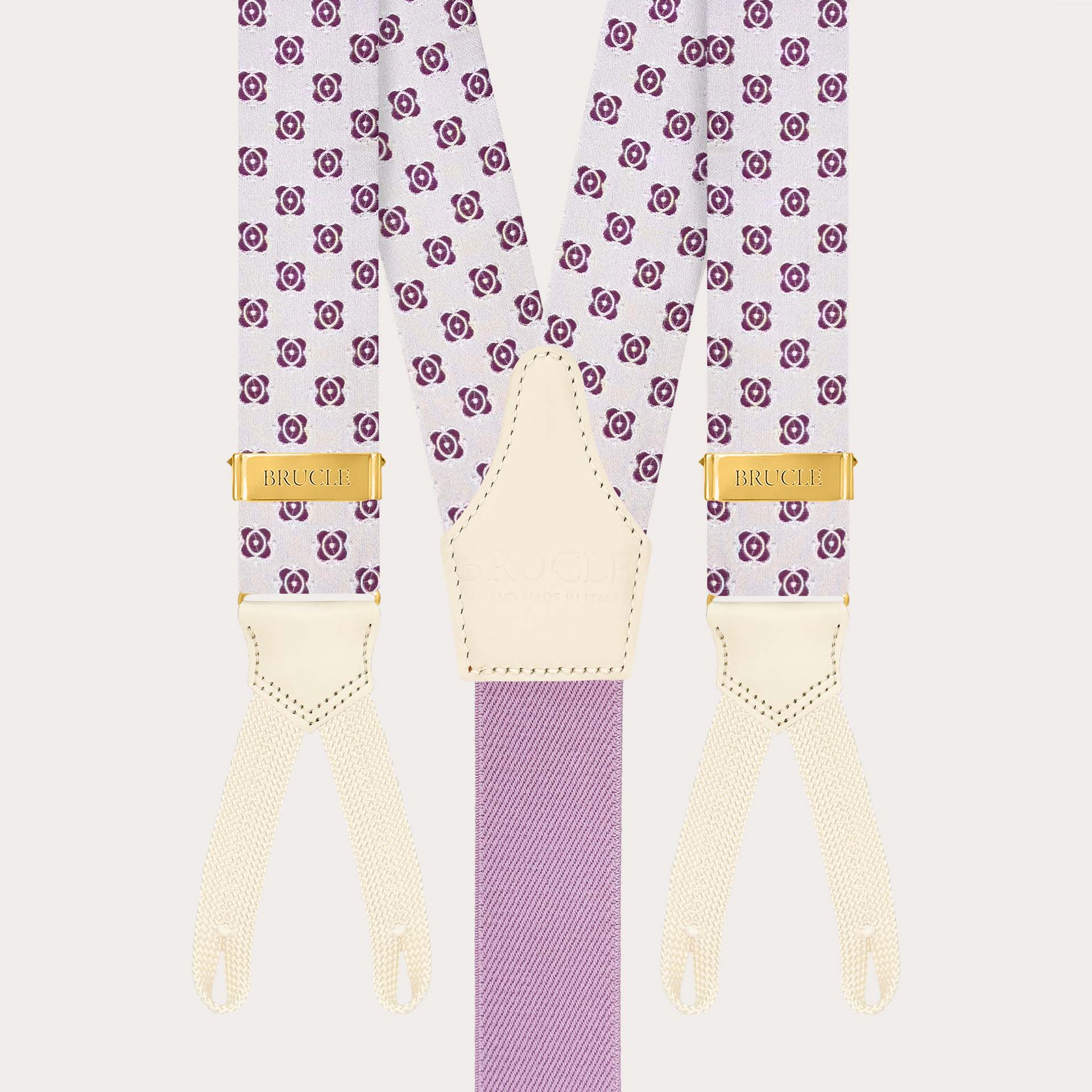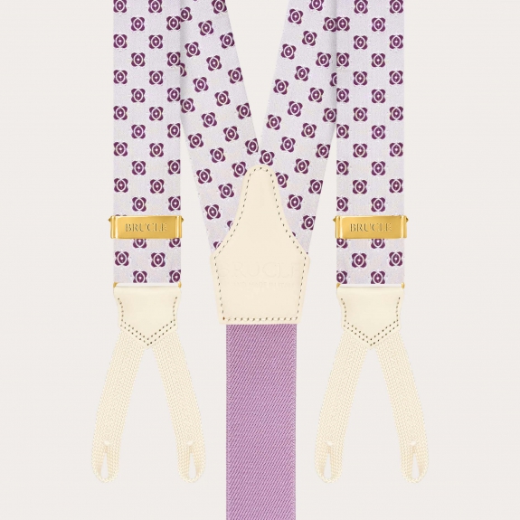 Refined and distinctive, the white silk braces with fuchsia floral pattern featuring buttonholes by BRUCLE embody timeless masculine elegance.