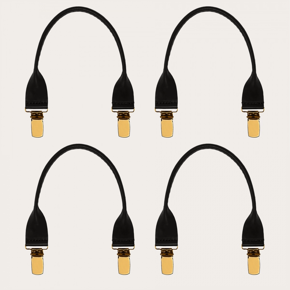 This set of 4 black leather loops with gold-tone clips is a stylish way to upgrade your BRUCLE suspenders. Bold and elegant, they are easy to attach and ideal for customizing or replacing the ends of your suspenders. Handmade in Italy from premium materials.