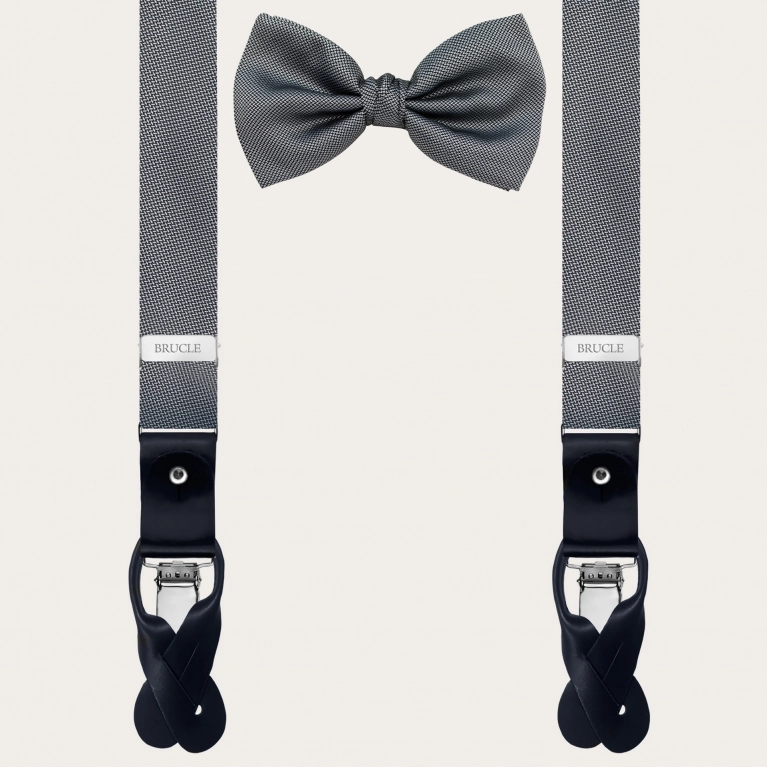 Coordinated formal set in fine jacquard silk in a powder blue shade, composed of suspenders, pocket square, and bow tie.