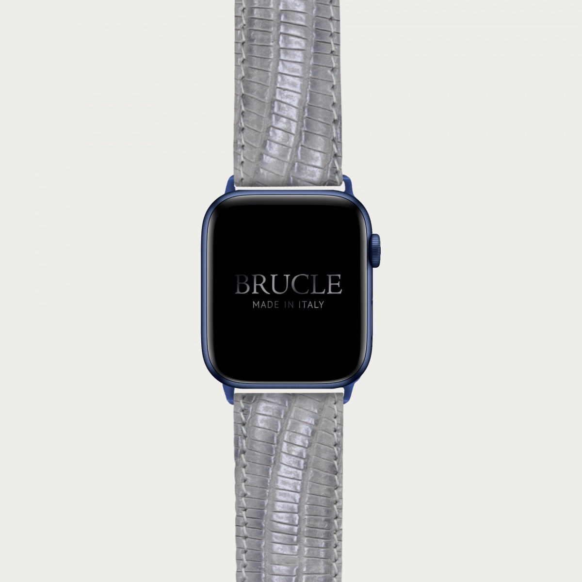 Correa artesanal gris en piel auténtica con exclusivo grabado tridimensional tipo tejus. Hecha íntegramente en Italia con materiales de alta calidad, está diseñada para complementar tanto smartwatches como relojes clásicos. Compatible con Apple Watch Series 1 a 10, desde cajas de 38 mm hasta 49 mm, Galaxy Watch 3 y cualquier reloj con anclaje de 22 o 24 mm.