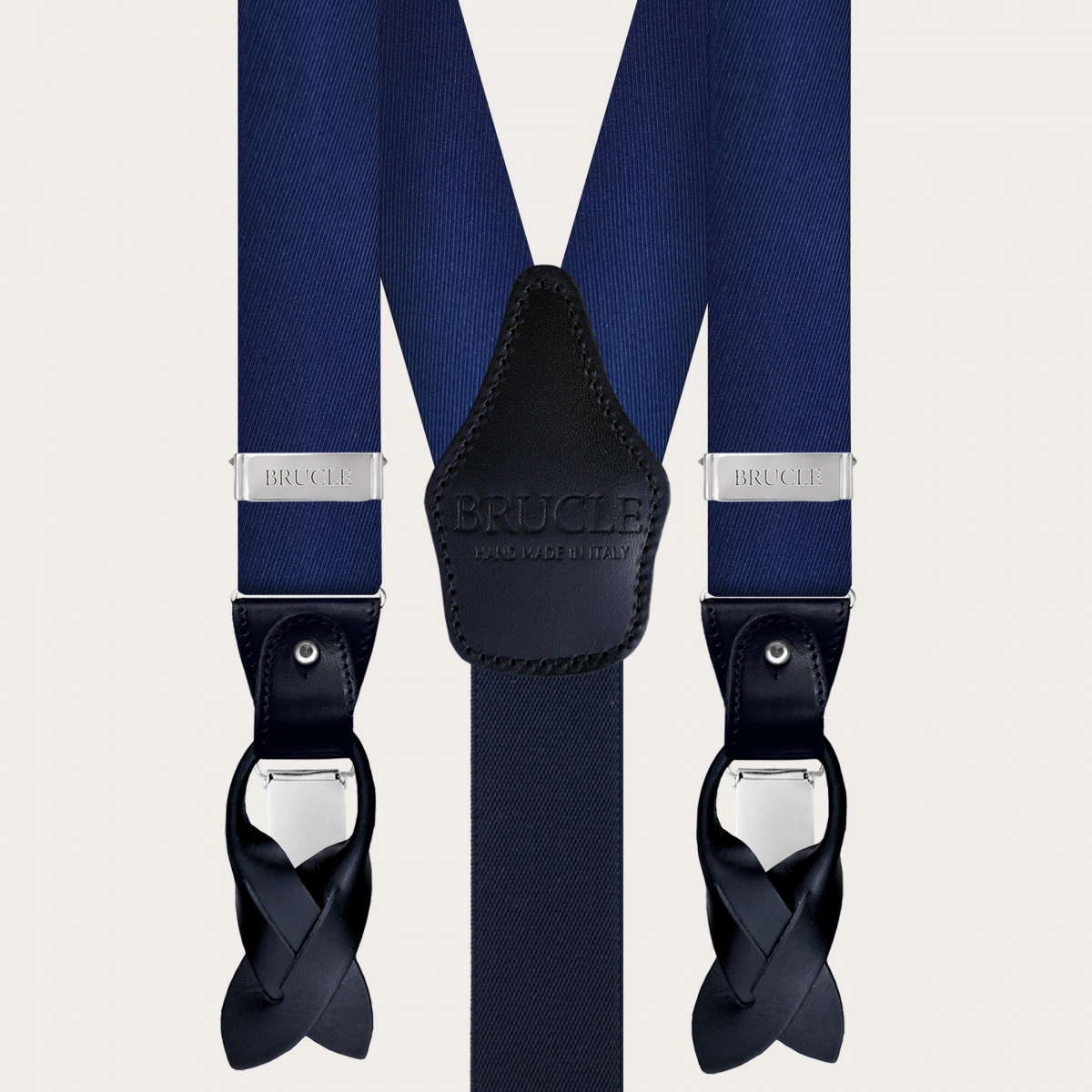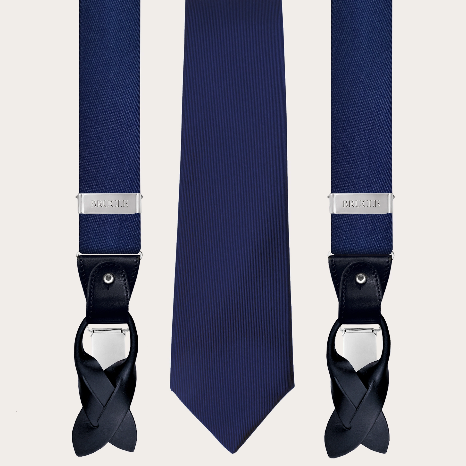 Tirantes y corbata de hombre a juego en elegante jacquard de seda azul. Un conjunto perfecto para ceremonias y veladas elegantes.