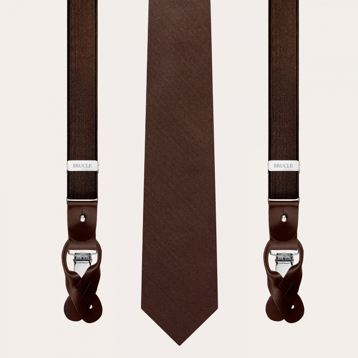 Elegante conjunto de ceremonia para hombre compuesto por corbata de seda y tirantes de doble uso, en un refinado tono marrón.