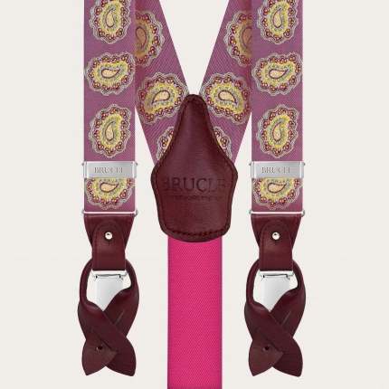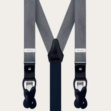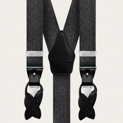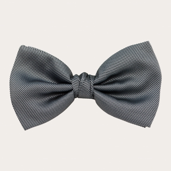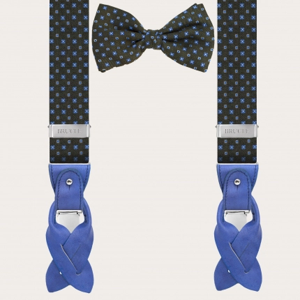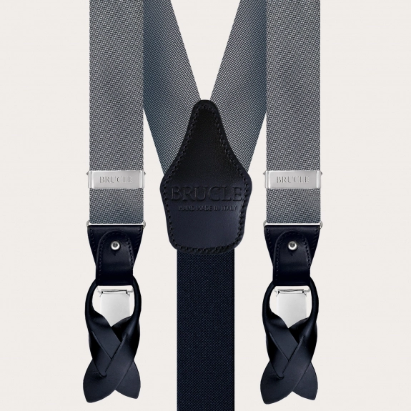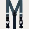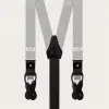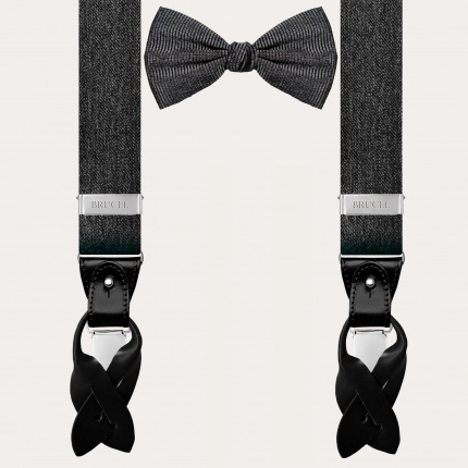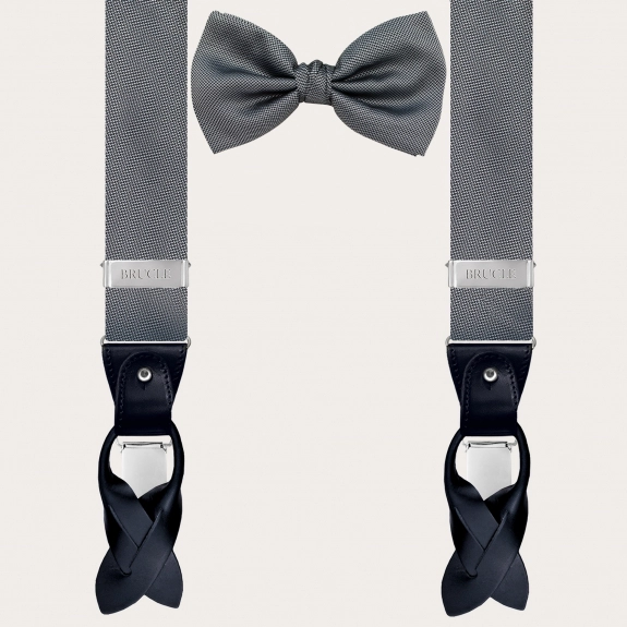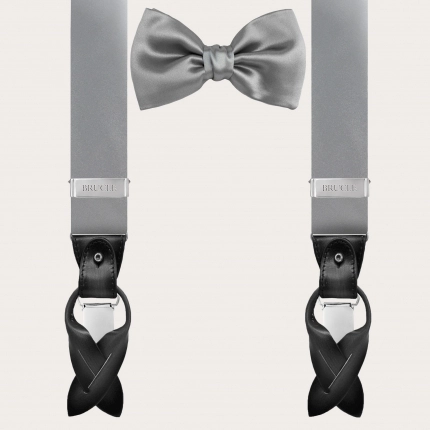 Conjunto coordinado de tirantes doble uso y pajarita en elegante seda gris. Un juego completamente libre de níquel y 100% Made in Italy.