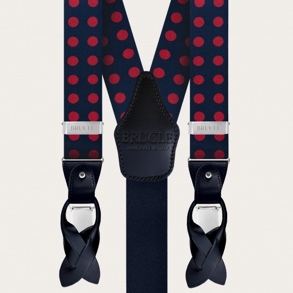 Los tirantes de seda azul con lunares ofrecen un uso dual, perfectos para ser usados con botones o clips. Hechos a mano en seda de alta calidad, se destacan por su versatilidad, asegurando un ajuste perfecto y una comodidad extraordinaria. Elegantes y refinados, estos tirantes para hombres son un símbolo del auténtico Made in Italy.La pajarita roja de seda añade un toque sofisticado a tu estilo. Pre-nudada para facilitar su uso, esta pajarita es ajustable para garantizar un ajuste cómodo y preciso. Con una altura de lazo de 7 cm, esta pajarita de seda roja resulta ser el accesorio perfecto para cualquier ocasión especial. Agrega un toque de estilo único a tu guardarropa con el conjunto coordinado de tirantes y pajarita de seda de BRUCLE.