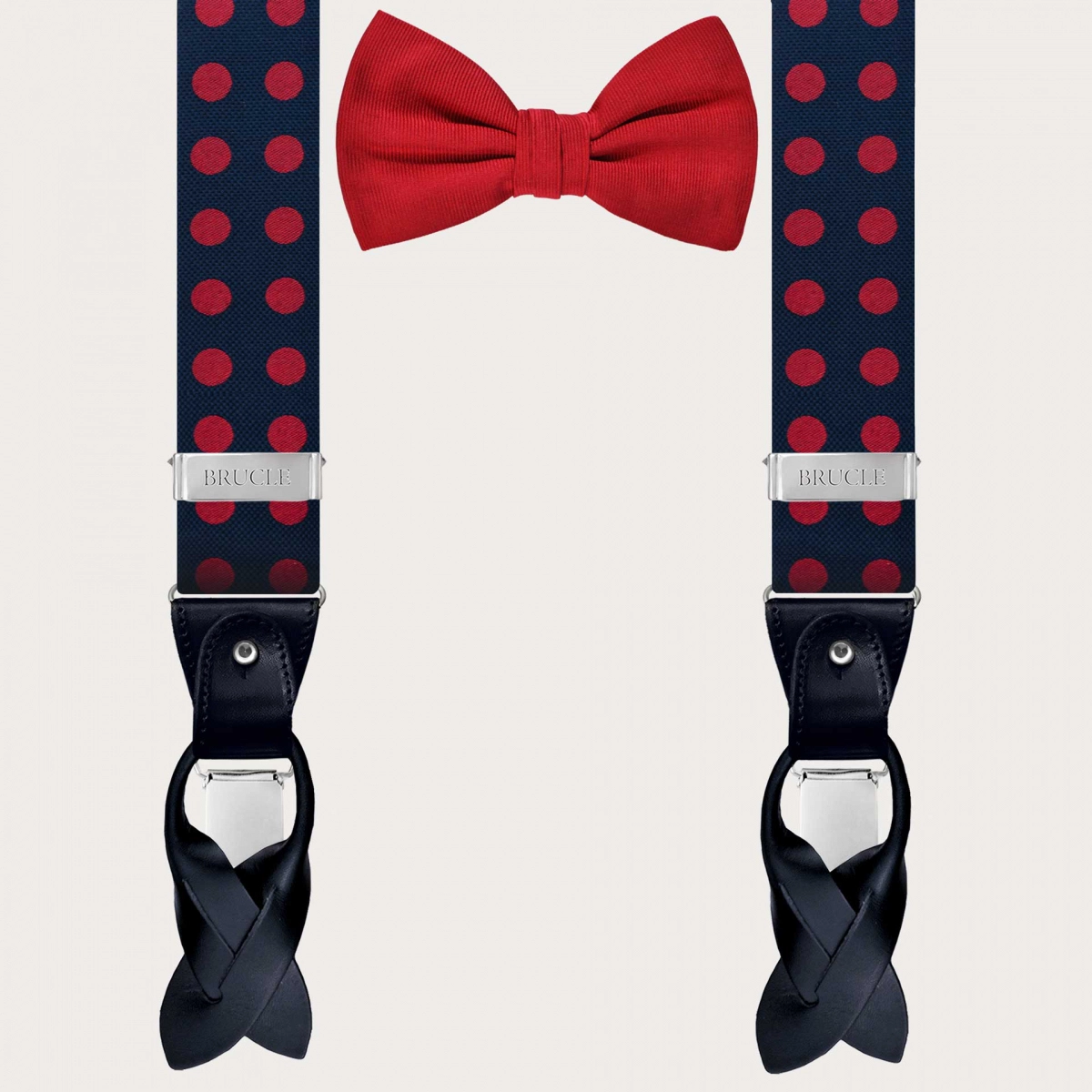 Tirantes y pajarita de seda azul con lunares y pajarita roja