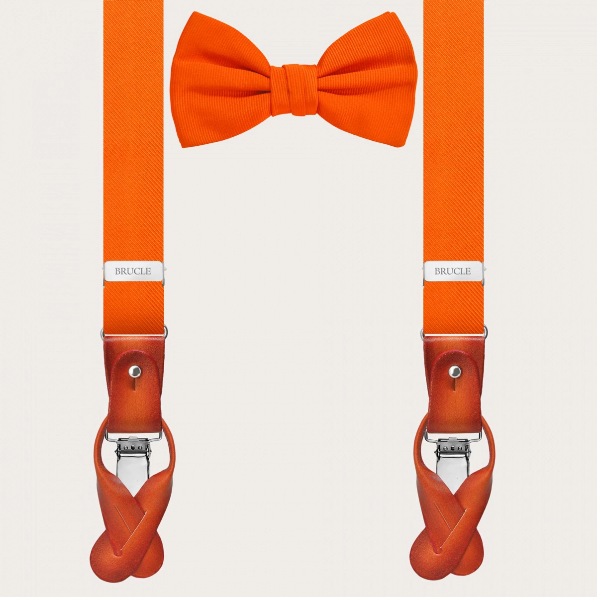 Los tirantes estrechos de seda naranja ofrecen versatilidad gracias a las piezas frontales de cuero pintadas a mano que permiten alternar entre botones y clips, adaptándose a cada necesidad de estilo. La posibilidad de personalizar aún más el conjunto con grabados en clips y partes de cuero, hacen de este conjunto un verdadero símbolo de elegancia y refinamiento. La pajarita naranja preanudada de seda enriquece el conjunto, garantizando un toque exclusivo e impecable en tu look. Ajustable mediante un práctico gancho, es el detalle que puede definir momentos especiales, agregando una chispa de vivacidad y un encanto atemporal.