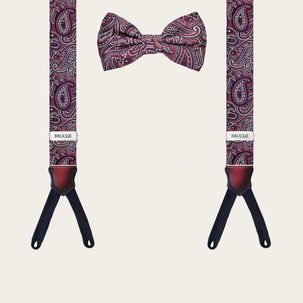 Descubre la elegancia atemporal con el set de tirantes estrechos paisley burdeos y pajarita de seda a juego de BRUCLE.