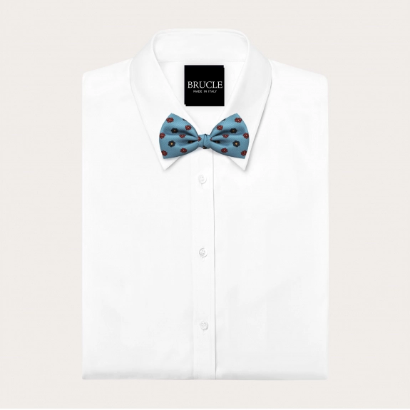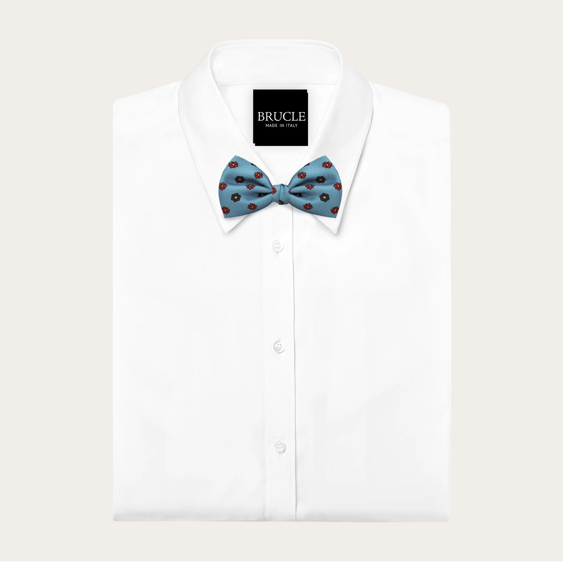 Exclusivo pajarita floral celeste para hombre en seda. Pre-atado y listo para usar, es versátil, adecuado para un estilo casual pero también para añadir alegría a un atuendo súper formal.