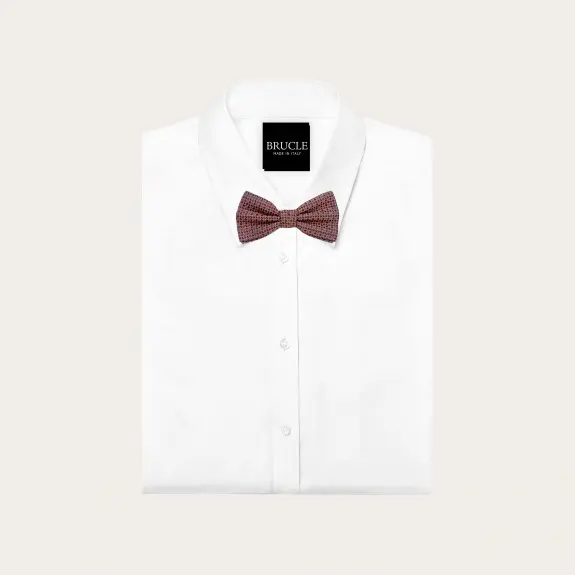 Elegante pajarita pre-anudada de seda jacquard con un microdibujo de estilo corbata que mezcla armoniosamente el marrón, el azul y el naranja.