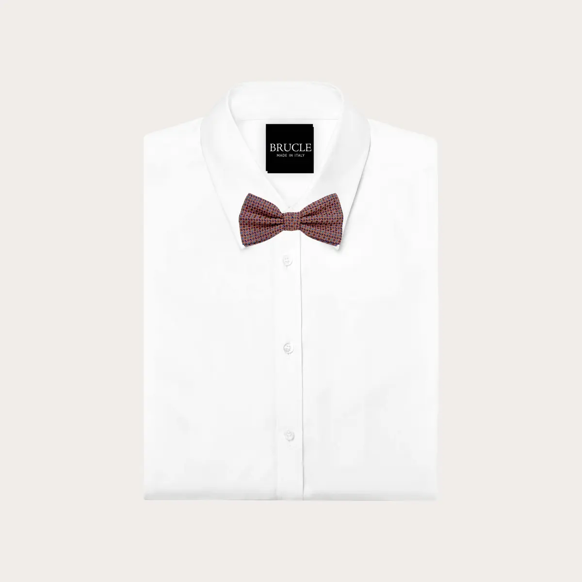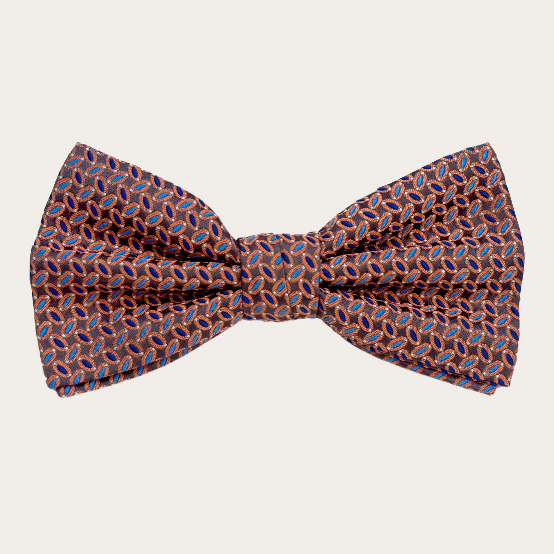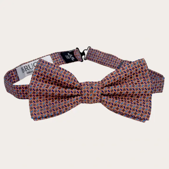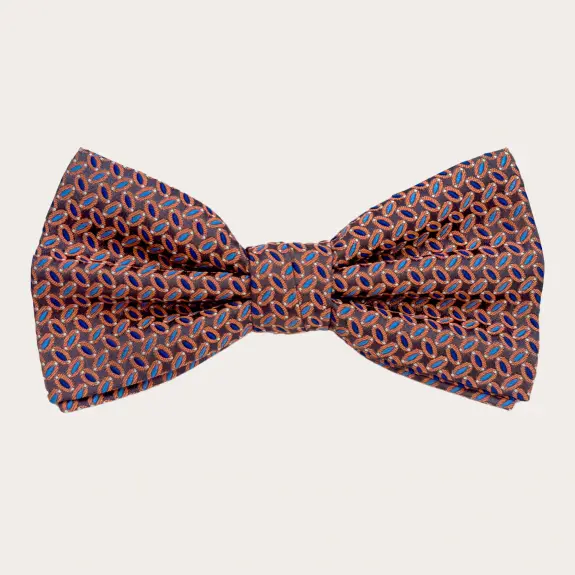 Pajarita pre-anudada en seda marrón, naranja y azul con microdibujo