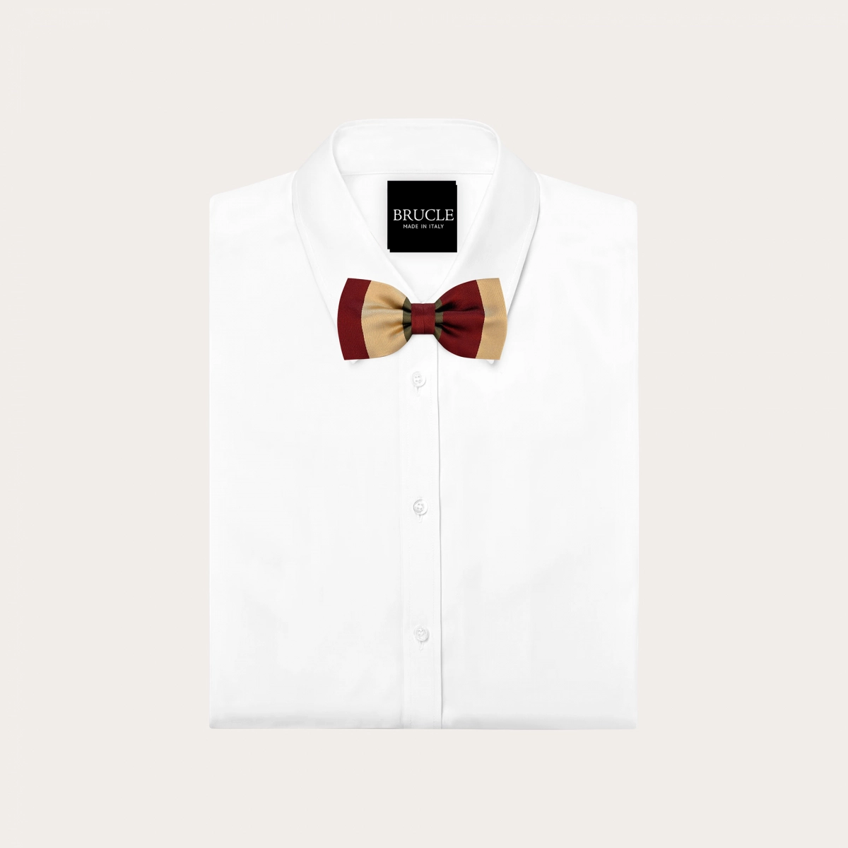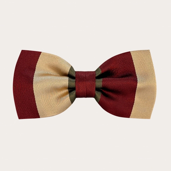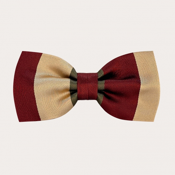 Pajarita regimental con rayas verticales doradas, verdes y burdeos en seda.