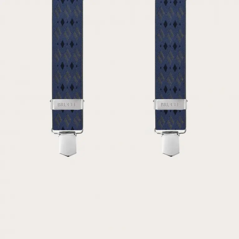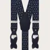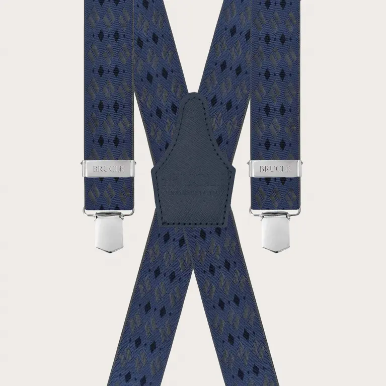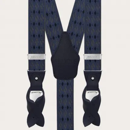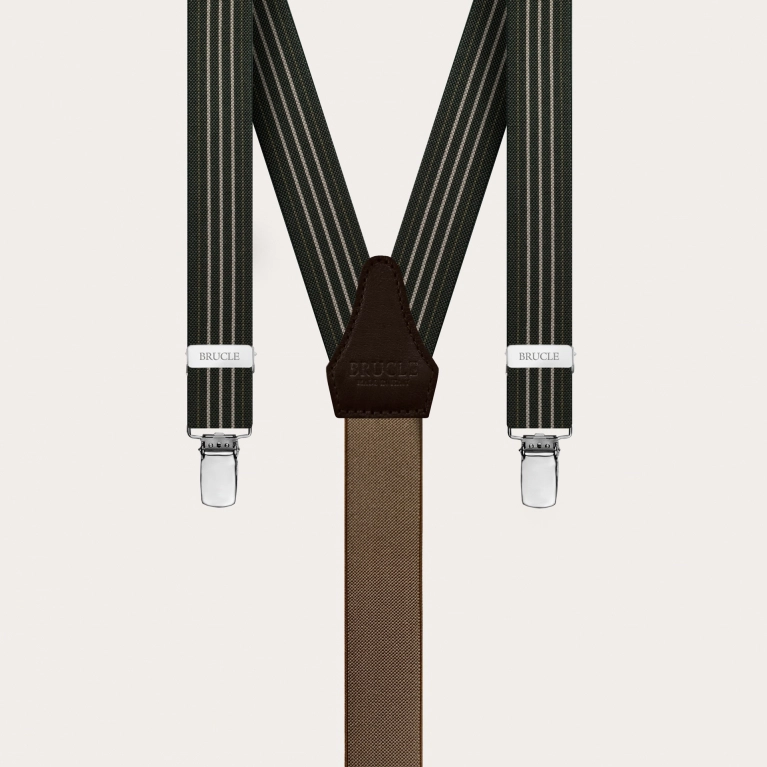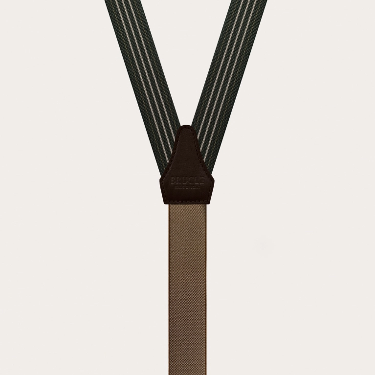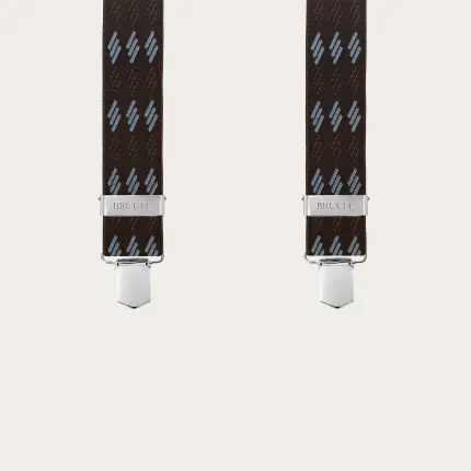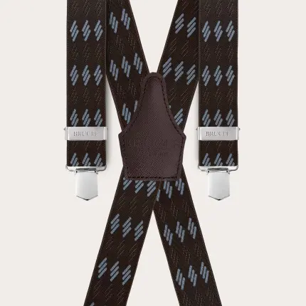 Tirantes elásticos unisex marrones con rayas azules y panel trasero de auténtico cuero saffiano a juego.