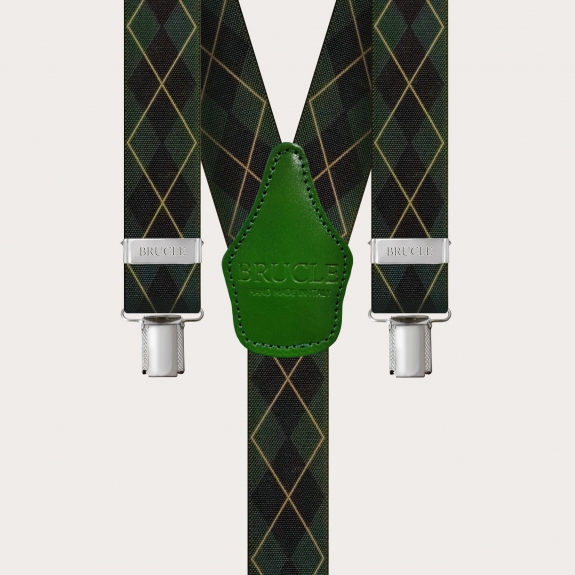 Tirantes elásticos unisex en forma de Y con cuadros verdes, hechos a mano en Italia con clips de calidad.