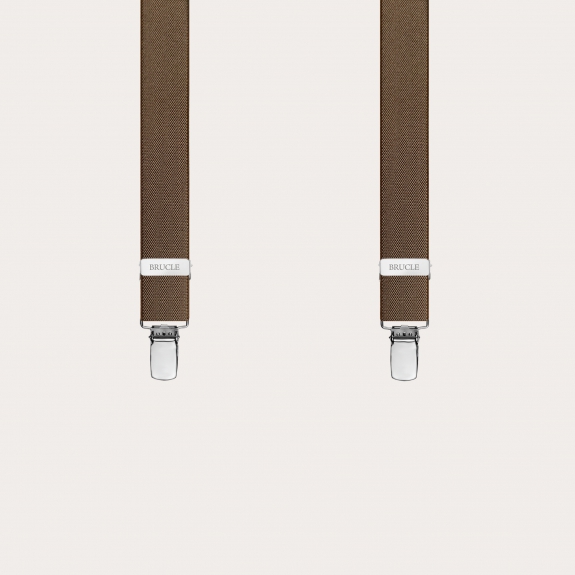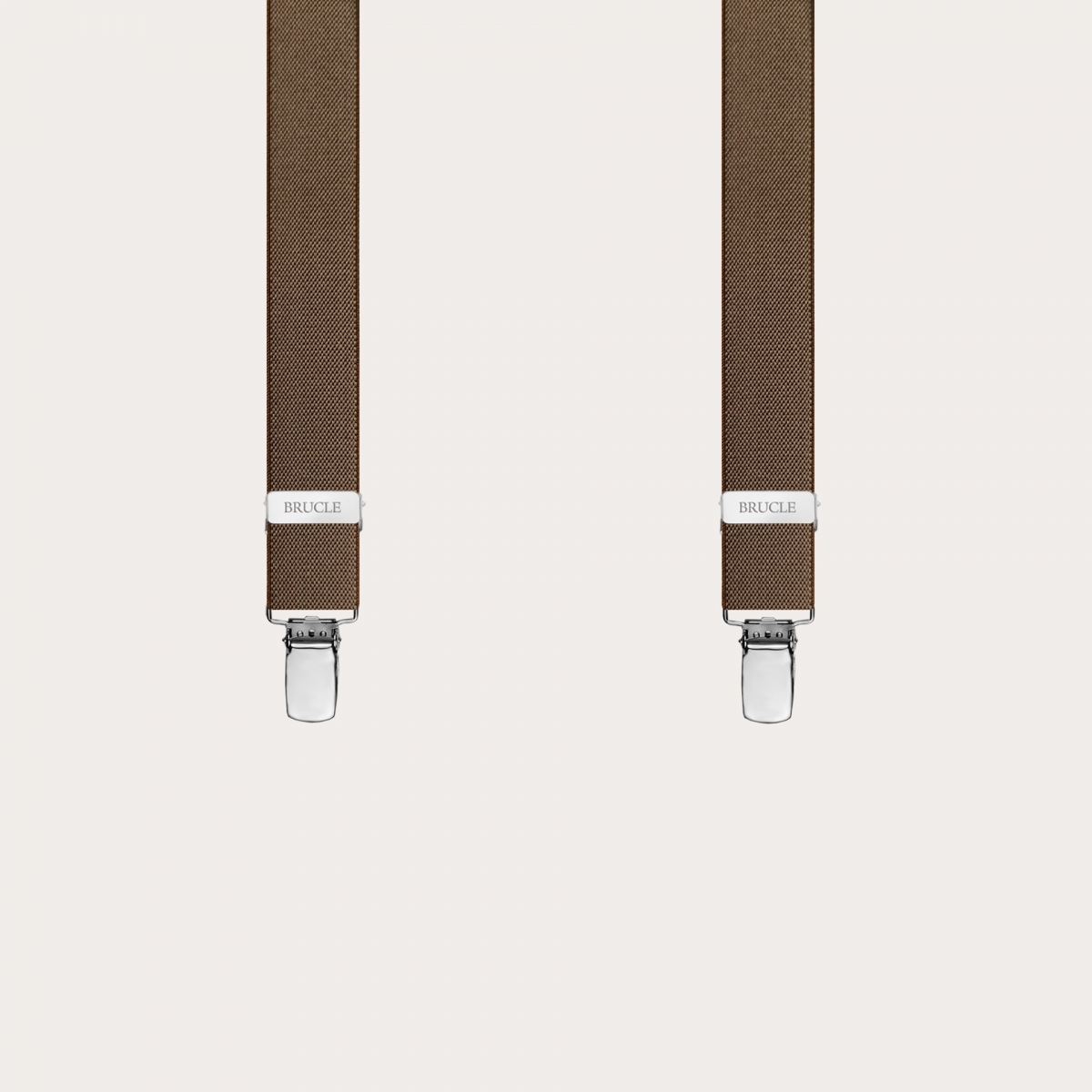 Tirantes en Y en elástico marron, unisex, con espalda en piel auténtica de vacuno. El color los hace fáciles de combinar y aptos para cualquier ocasión.