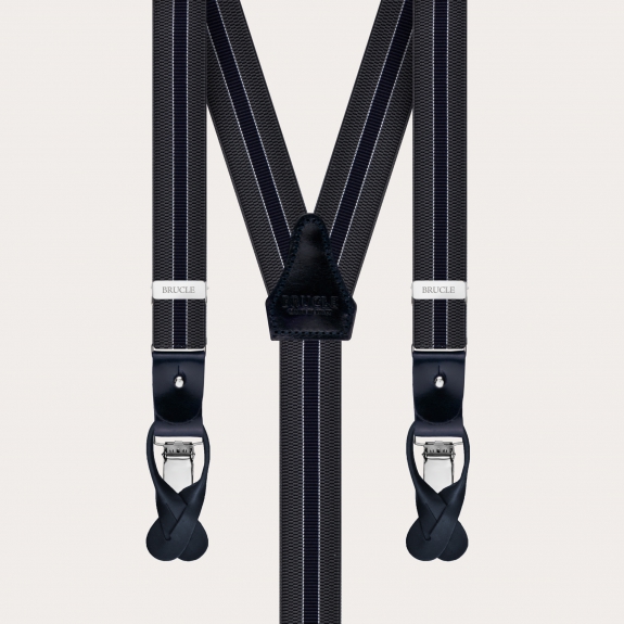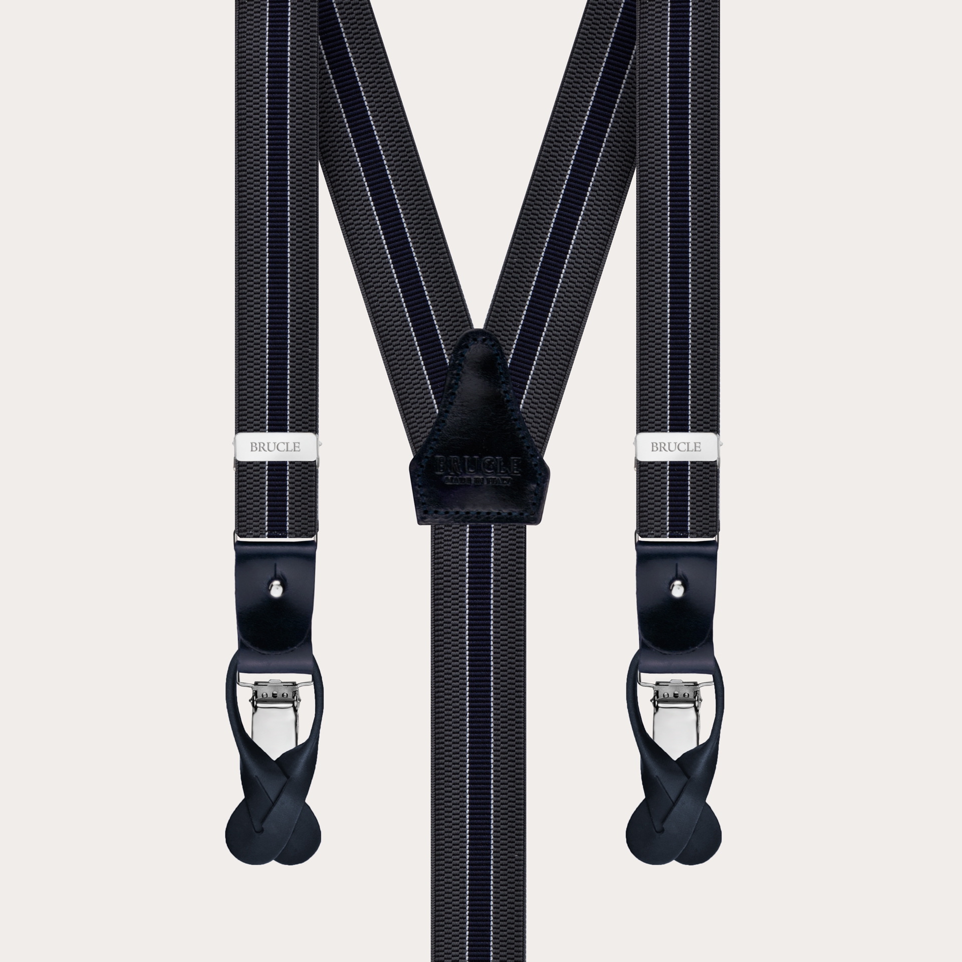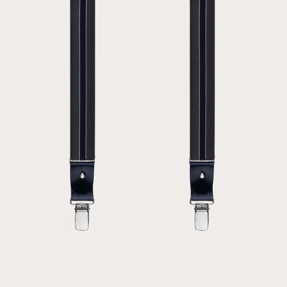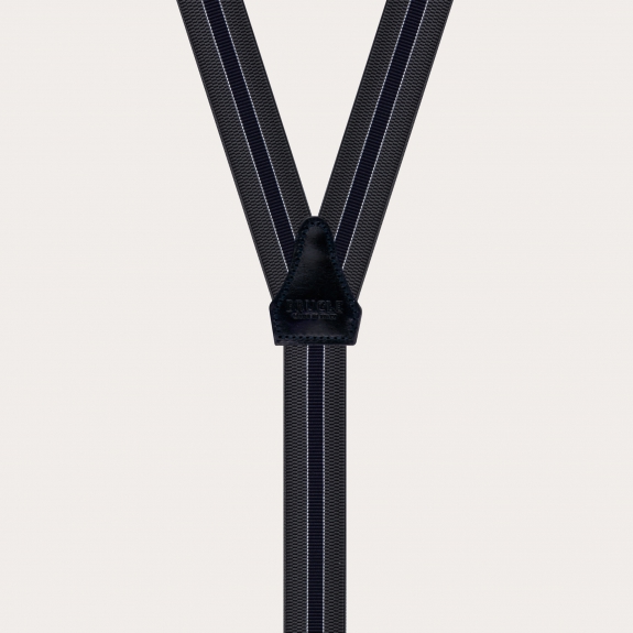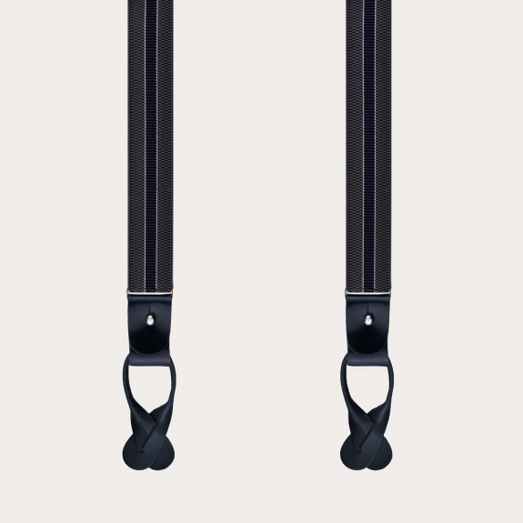 Tirantes elásticos negros de raso elástico con parte trasera de piel auténtica a juego, en forma de Y.