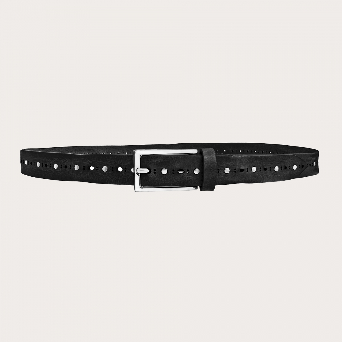 Ceinture noire au style affirmé, confectionnée en cuir véritable à tannage végétal et sublimée par des clous métalliques et un motif gravé au laser. Son allure contemporaine, associée à une boucle brillante sans nickel, en fait l’accessoire parfait pour rehausser une tenue urbaine et tendance. Chaque pièce est entièrement réalisée à la main en Italie.